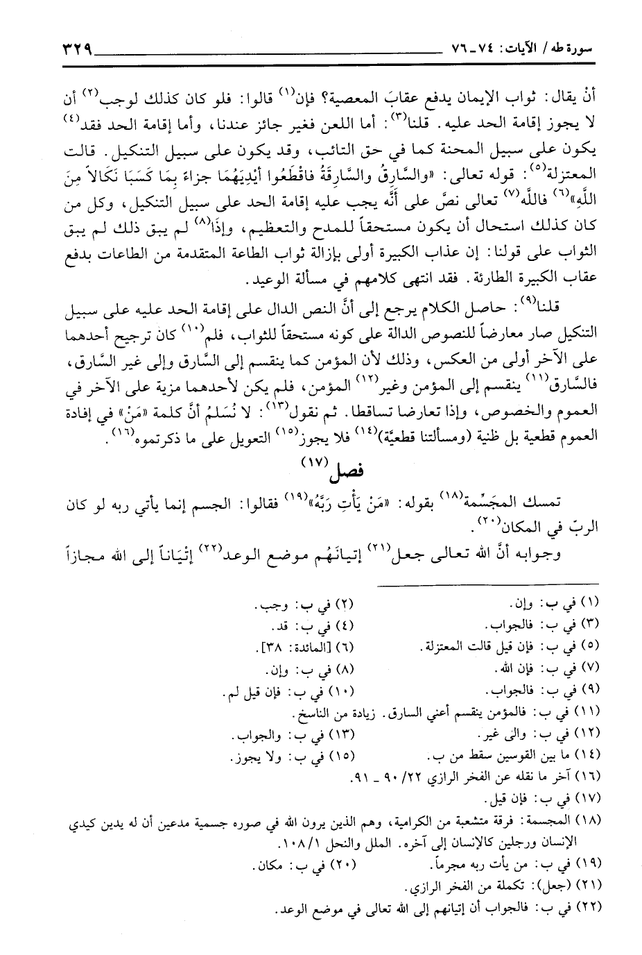 أنْ يقال: ثواب الإيمان يدفع عقابَ المعصية؟ فإن قالوا: فلو كان كذلك لوجب أن لا يجوز إقامة الحد عليه. قلنا: أما اللعن فغير جائز عندنا، وأما إقامة الحد فقد يكون على سبيل المحنة كما في حق التائب، وقد يكون على سبيل التنكيل. قالت المعتزلة: قوله تعالى: {والسارق والسارقة فاقطعوا أَيْدِيَهُمَا جَزَآءً بِمَا كَسَبَا نَكَالاً مِّنَ الله} [المائدة: 38] فالله تعالى نصَّ على أنَّه يجب عليه إقامة الحد على سبيل التنكيل، وكل من كان كذلك استحال أن يكون مستحقاً للمدح والتعظيم، وإذَا لم يبق ذلك لم يبق الثواب على قولنا: إن عذاب الكبيرة أولى بإزالة ثواب الطاعة المتقدمة من الطاعات بدفع عقاب الكبيرة الطارئة. فقد انتهى كلامهم في مسألة الوعيد.