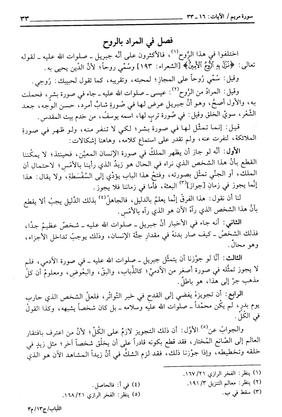 وقيل: المرادُ من الرُّوح: عيسى - صلوات الله عليه - جاء في صورة بشرٍ، فحملت به، والأول أصحُّ، وهو أنَّ جبريل عرض لها في صُورةِ شابٍّ أمرد، حسن الوجه، جعد الشَّعْر، سويِّ الخلق وقيل: في صُورة تربٍ لها، اسمه يوسفُ، من خدم بيت المقدس.