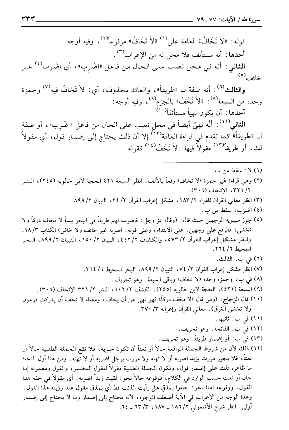 والثالث: أنه صفة ل «طريقاً» ، والعائد محذوف، أي: لاَ تَخَافُ فيه وحمزة وحده من السبعة: «لاَ تَخَفْ» بالجزم، وفيه أوجه: