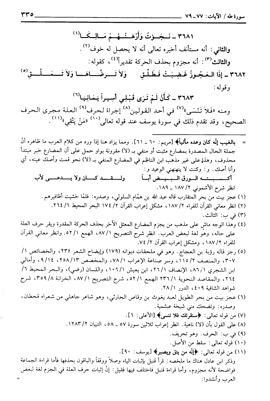 3683 - كَأَنْ لَمْ تَرَى قَبْلِي أسِيراً يَمَانِيَا ... ومنه «فَلاَ تَنْسَى» في أحد القولين إجراءً لحرف العلة مجرى الحرف الصحيح، وقد تقدم ذلك في سورة يوسف عند قوله تعالى «مَنْ يَتَّقِي» .