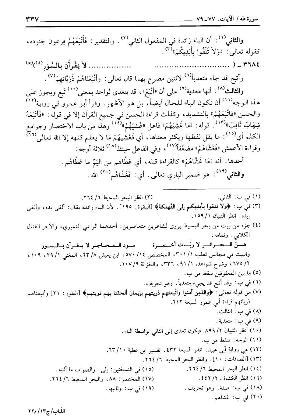 والثالث: أنها معدية على أن «أتْبَعَ» ، قد يتعدى لواحد بمعنى تَبع ويجوز على هذا الوجه أن تكون الباء للحال أيضاً، بل هو الأظهر. وقرأ أبو عمرو في رواية والحسن «فأتْبَعَهُمْ» بالتشديد، وكذلك قراءة الحسن في جميع القرآن إلا في قوله: