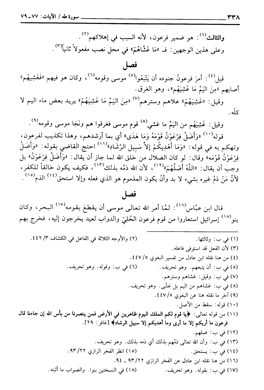 قيل: أمرَ فرعونُ جنوده أن يَتْبَعُوا موسى وقومه، وكان هو فيهم «فَغَشِيَهُمْ» أصابهم «مِنَ اليَمِّ مَا غَشِيَهُمْ» ، وهو الغرق.