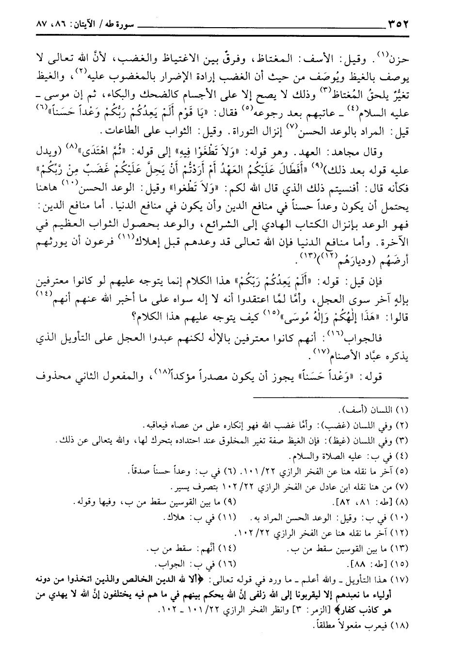 حزن. وقيل: الأسف: المغتاط، وفرق بين الاغتياط والغضب، لأنَّ الله تعالى لا يوصف بالغيظ ويُوصَف من حيث أن الغضب إرادة الإضرار بالمغضوب عليه، والغيط تغيُّرٌ يلحقُ المُغتاط وذلك لا يصح إلى على الأجسام كالضحك والبكاء، ثم إن موسى - عليه السلام - عاتبهم بعد رجوعه فقال: {ياقوم أَلَمْ يَعِدْكُمْ رَبُّكُمْ وَعْداً حَسَناً} قيل: المراد بالوعد الحسن إنزال التوراة. وقيل: الثواب على الطاعات.