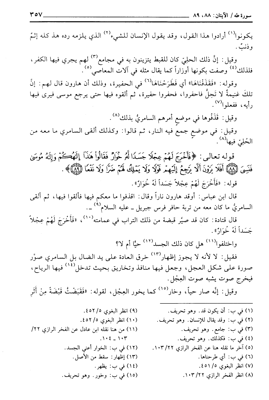 قال ابن عباس: أوقد هارون ناراً وقال: اقذفوا ما معكم فيها فألقوا فيها، ثم ألقى السامريُّ ما كان معه من تربة حافر فرس جبريل - عليه السلام -.