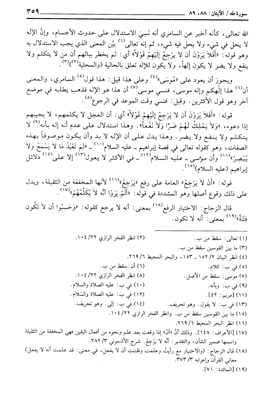 الله تعالى، كأنه أخبر عن السامري أنه نَسِيَ الاستدلال على حدوث الأجسام، وإنَّ الإلَه لا يحل في شيء ولا يحل فيه شيء، ثم إنه تعالى بيَّن المعنى الذي يجب الاستدلال به وهو قوله: {أَفَلاَ يَرَوْنَ أَلاَّ يَرْجِعُ إِلَيْهِمْ قَوْلاً} أي: لم يخطر ببالهم أن من لا يتكلم ولا ينفع ولا يضر لا يكون إلهاً، ولا يكون للإله تعلق بالحالية (والمحلية) .