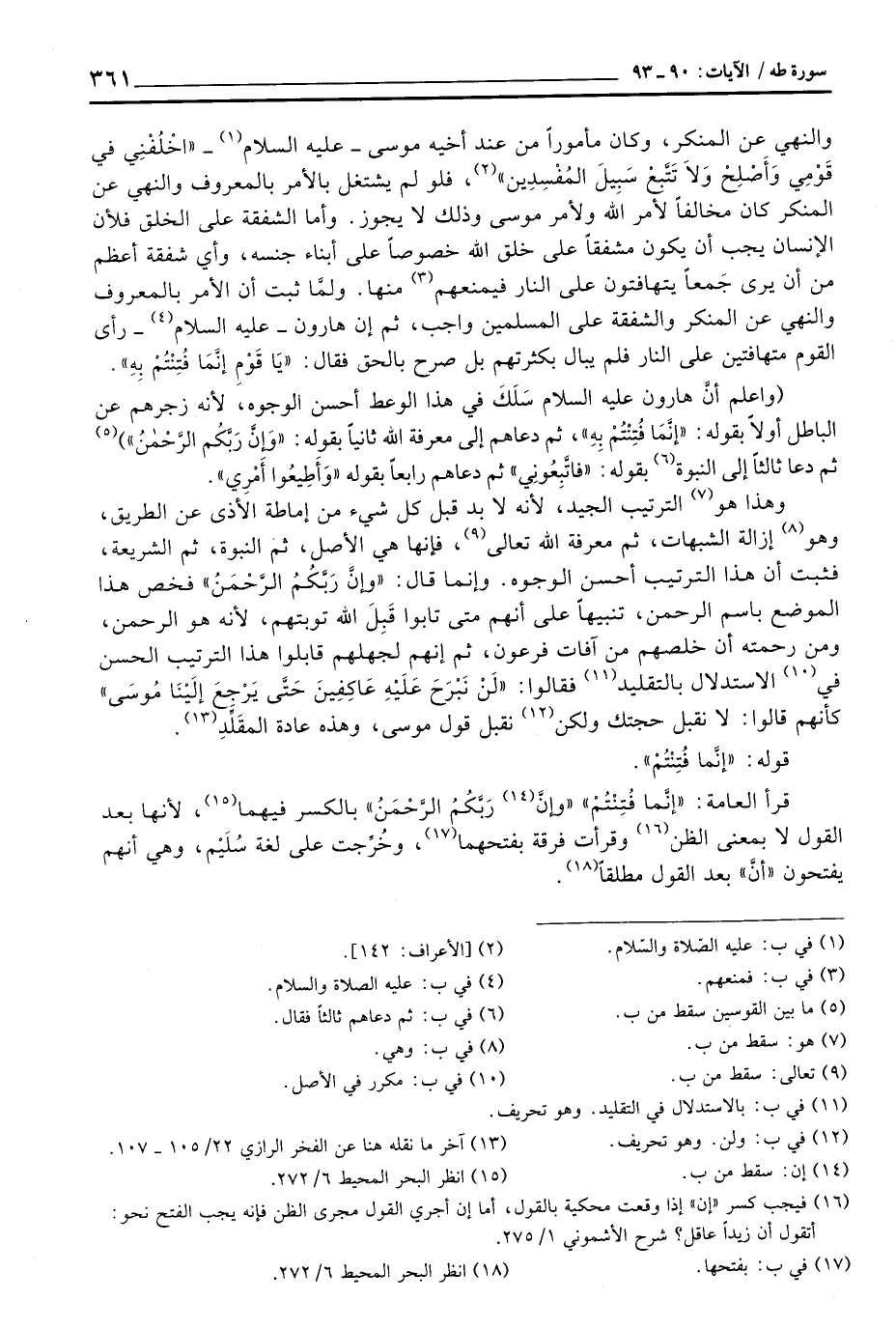 والنهي عن المنكر، وكان مأموراً من عند أخيه موسى - عليه السلام - {اخلفني فِي قَوْمِي وَأَصْلِحْ وَلاَ تَتَّبِعْ سَبِيلَ المفسدين} [الأعراف: 142] ، فلو كان يشتغل بالأمر بالمعروف والنهي عن المنكر عنى المنكر كان مخالفاً لأمر الله ولأمر موسى وذلك لا يجوز. وأما الشفقة على الخلق فلأن الإنسان يجب أن يكون مشفقاً على خلق الله خصوصاً على أبناء جنسه، وأي شفقة أعظم من أن يرى جَمعاً يتهافتون على النار فيمنعهم منها. ولمَّا ثبت أن الأمر بالمعروف والنهي عن المنكر والشفقة على المسلمين واجب، ثم إن هارون - عليه السلام - رأى القوم متهافتين على النار فيمنعهم منها. ولمَّا ثبت أن الأمر بالمعروف والنهي عن المنكر والشفقة على المسلمين واجب، ثم إن هارون - عليه السلام - رأى القوم متهافتين على النار فلم يبال بكثرتهم بل صرح بالحق فقال: {ياقوم إِنَّمَا فُتِنتُمْ بِهِ} .