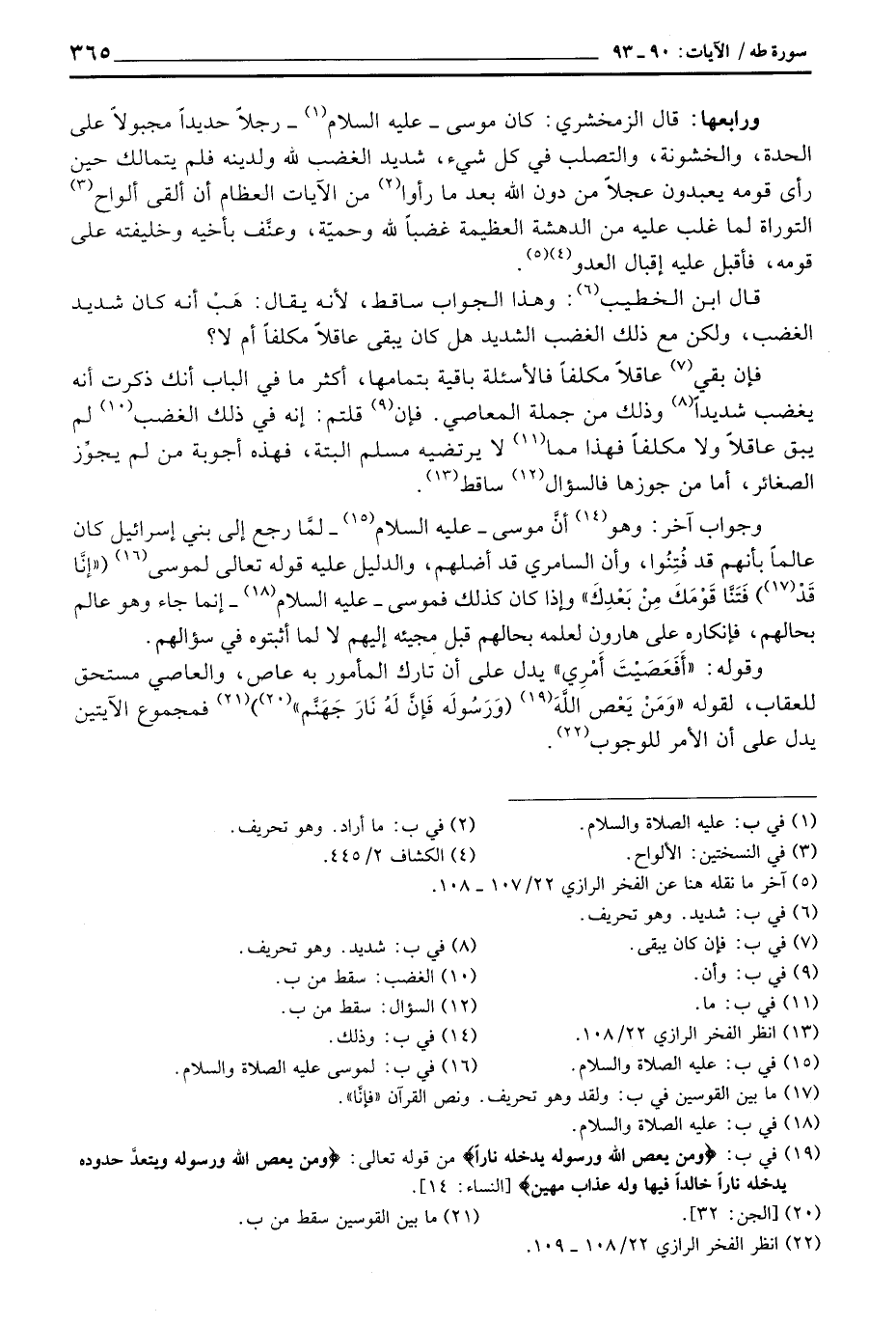 وجواب آخر: وهو أنَّ موسى - عليه السلام - لمَّا رجع إلى بني إسرائيل كان عالماً بانهم قد فُتِنُوا، وأن السامري قد أضلهم، والدليل عليه قوله تعالى لموسى ( «إِنَّا قَدْ فَتَنَّا) قَوْمَكَ مِن بَعْدِكَ» وإذا كان كذلك فموسى - عليه السلام - إنما جاء وهو عالم بحالهم، فإنكاره على هارون لعلمه بحالهم قبل مجيئه إليهم لا لما أثبتوه في سؤالهم.