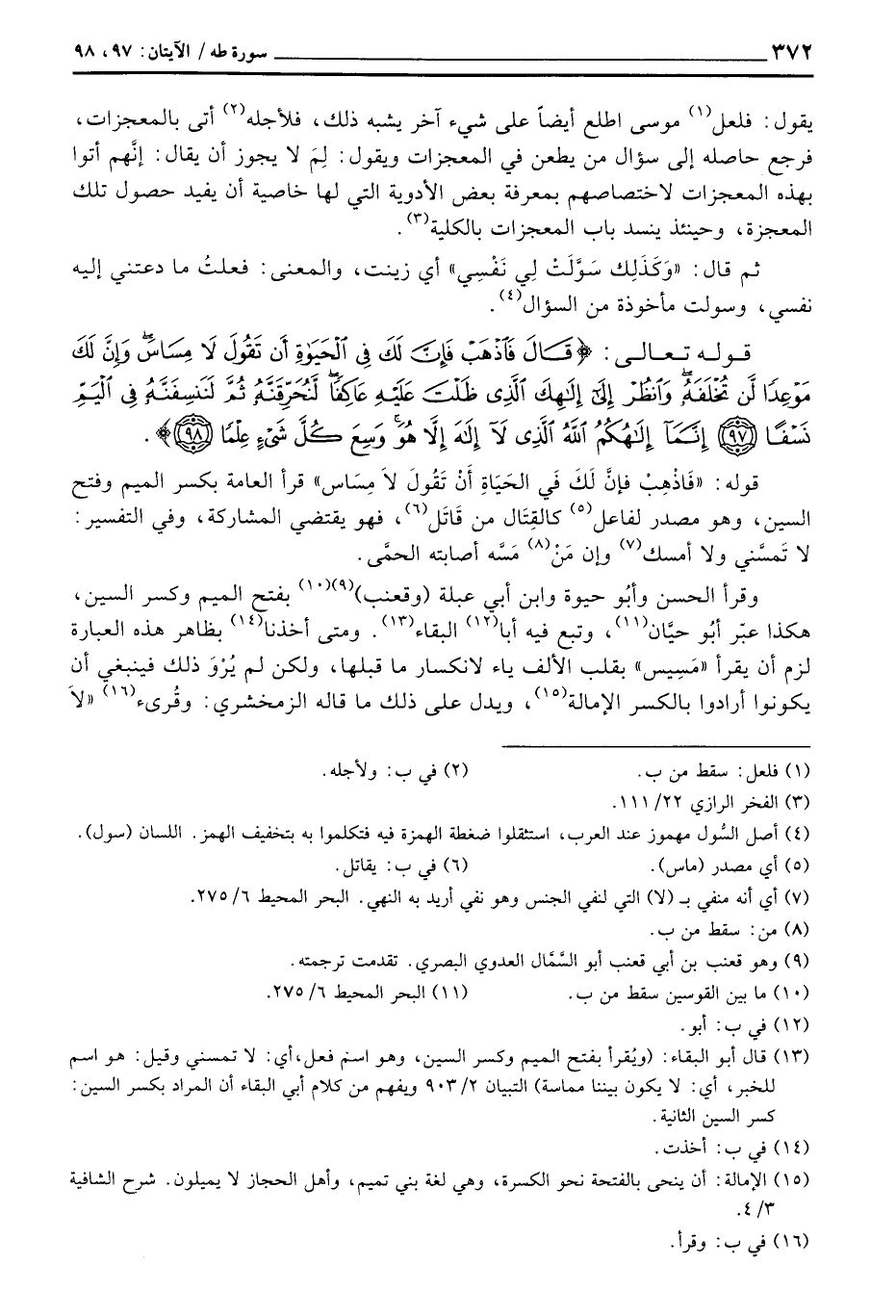 فَإِنَّ لَكَ فِي الحياة أَن تَقُولَ لاَ مِسَاسَ} قرأ العامة بكسر الميم وفتح السين، وهو مصدر لفاعل كالقِتَال من قَاتَلَ، فهو يقتضي المشاركة، وفي التفسير: لا تَمسَّنِي ولا أمسك وإن مَنْ مَسَّه أصابته الحمَّى. وقرأ الحسن وأبُو حيوة وابن أبي عبلة (وقعنب) بفتح الميم وكسر السين، هكذا عبّر أبُو حيَّان، وتبع فيه أبا البقاء. ومتى أخذنا بظاهر هذه العبارة لزم أن يقرأ «مَسِيس» بقلب الألف ياء لانكسار ما قبلها، ولكن لم يُرْوَ ذلك فينبغي أن يكونوا أرادوا بالكسر الإمالة، ويدل على ذلك ما قاله الزمخشري: وقُرئ «لاَ