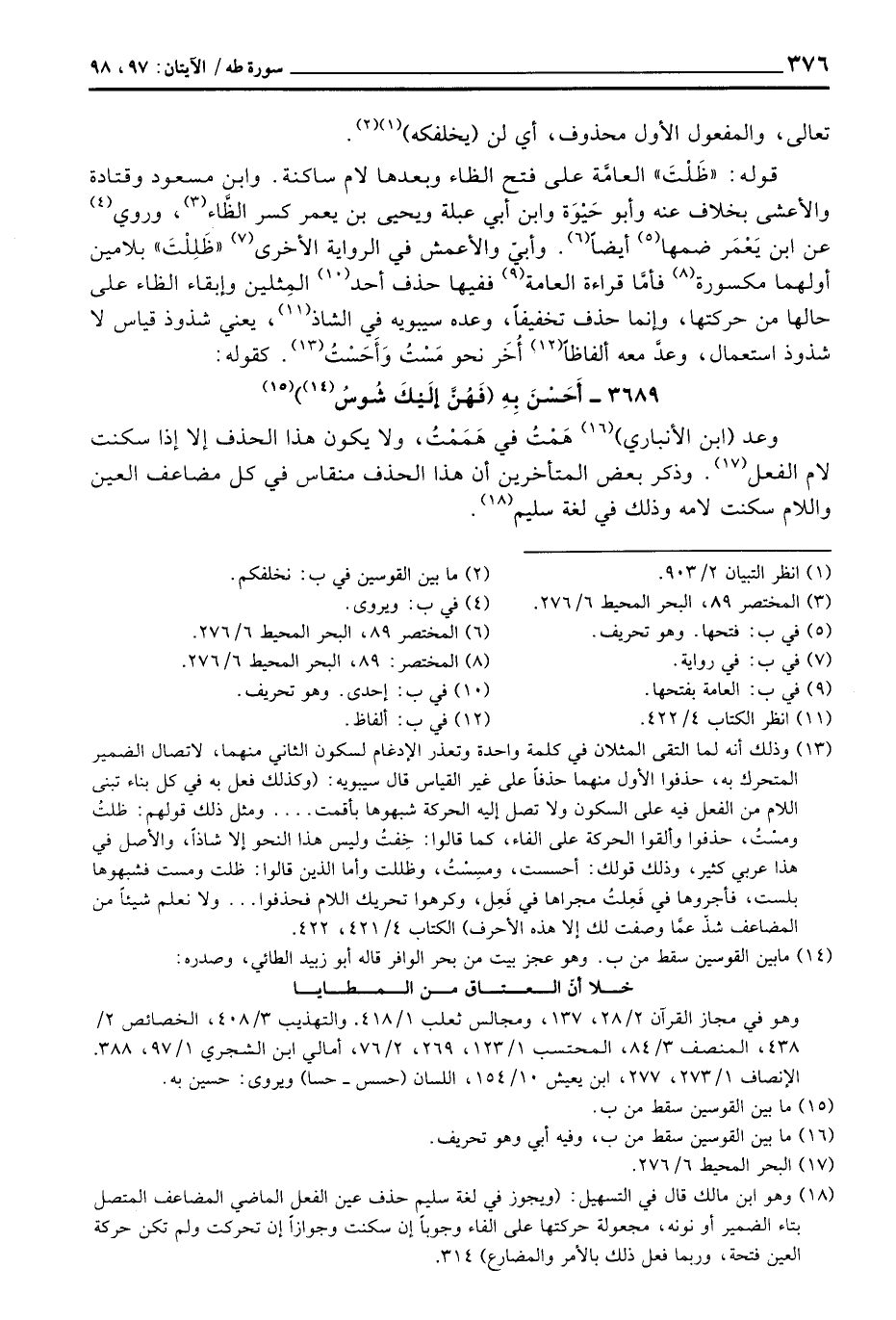 قوله: «ظَلْتَ» العامَّة على فتح الظاء وبعدها لام ساكنة. وابن مسعود وقتادة والأعشى بخلاف عنه وأبو حَيْوَة وابن أبي عبلة ويحيى بن يعمر كسر الظَّاء، وروي عن ابن يَعْمَر ضمها أيضاً. وأبيّ والأعمش في الرواية الأخرى «ظَلِلْتَ» بلامين أولهما مكسورة فأمَّا قراءة العامة ففيها حذف أحد المِثلين وإبقاء الظاء على حالها من حركتها، وإنما حذف تخفيفاً، وعده سيبويه في الشاذ، يعني شذوذ قياس لا شذوذ استعمال، وعدَّ معه ألفاظاً أُخَر نحو مَسْتُ وَأَحَسْتُ. كقوله: