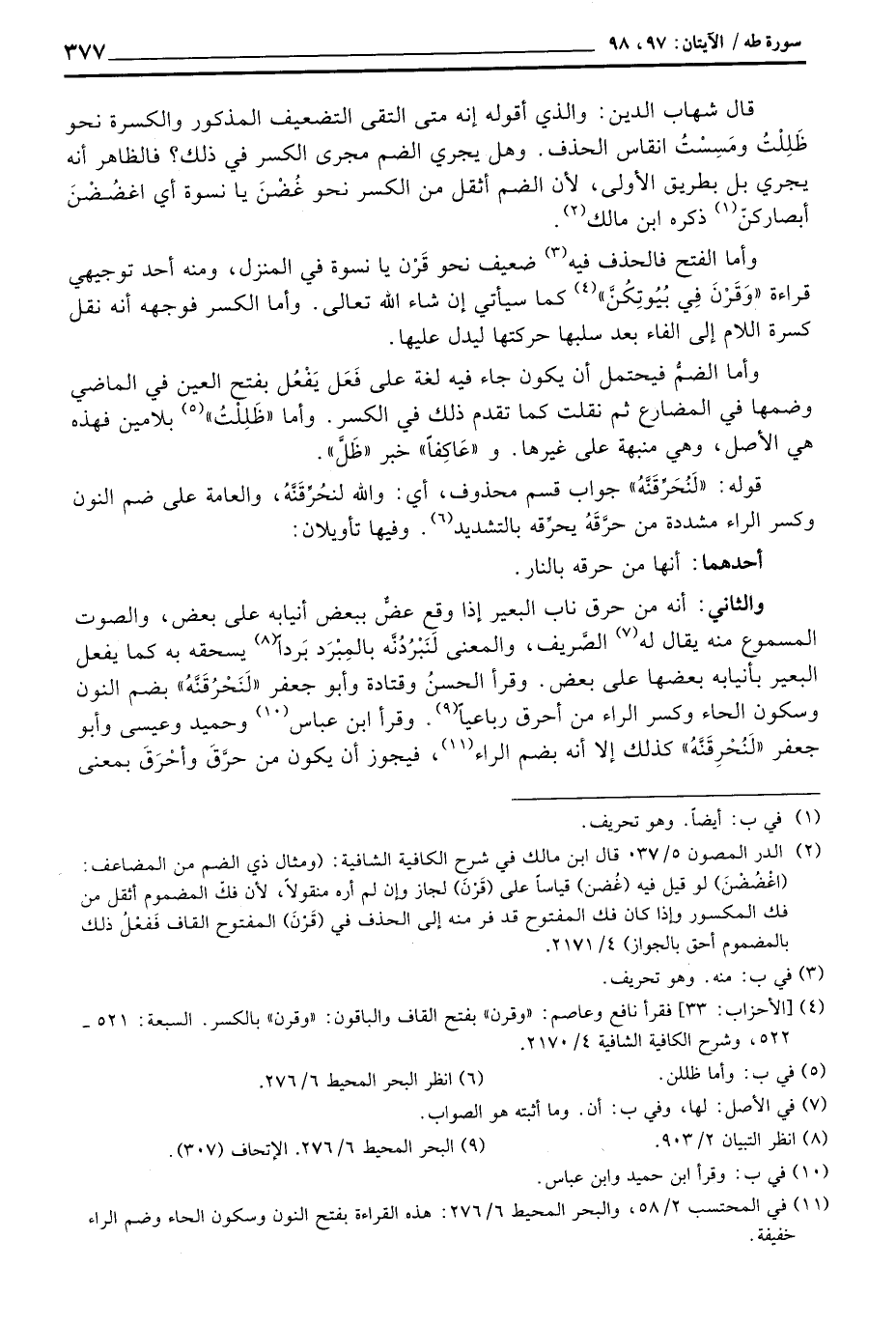 والثاني: أنه من حرق ناب البعير إذا وقع عضُّ أنيابه على بعض، والصوت المسموع منه يقال له الصَّريف، والمعنى لَنَبْرُدُنَّه بالمِبْرَدِ بَرداً يسحقه به كما يفعل البعير بأنيابه بعضها على بعض. وقرأ الحسنُ وقتادة وأبو جعفر» لَنَحْرُقَنَّهُ «بضم النون وسكون الحاء وكسر الراء من أحرق رباعياً. وقرأ ابن عباس وحميد وعيسى وأبو جعفر» لَنُحْرِقَنَّهُ «كذلك إلا أنه بضم الراء، فيجوز أن يكون من حرَّقَ وأحْرَقَ بمعنى