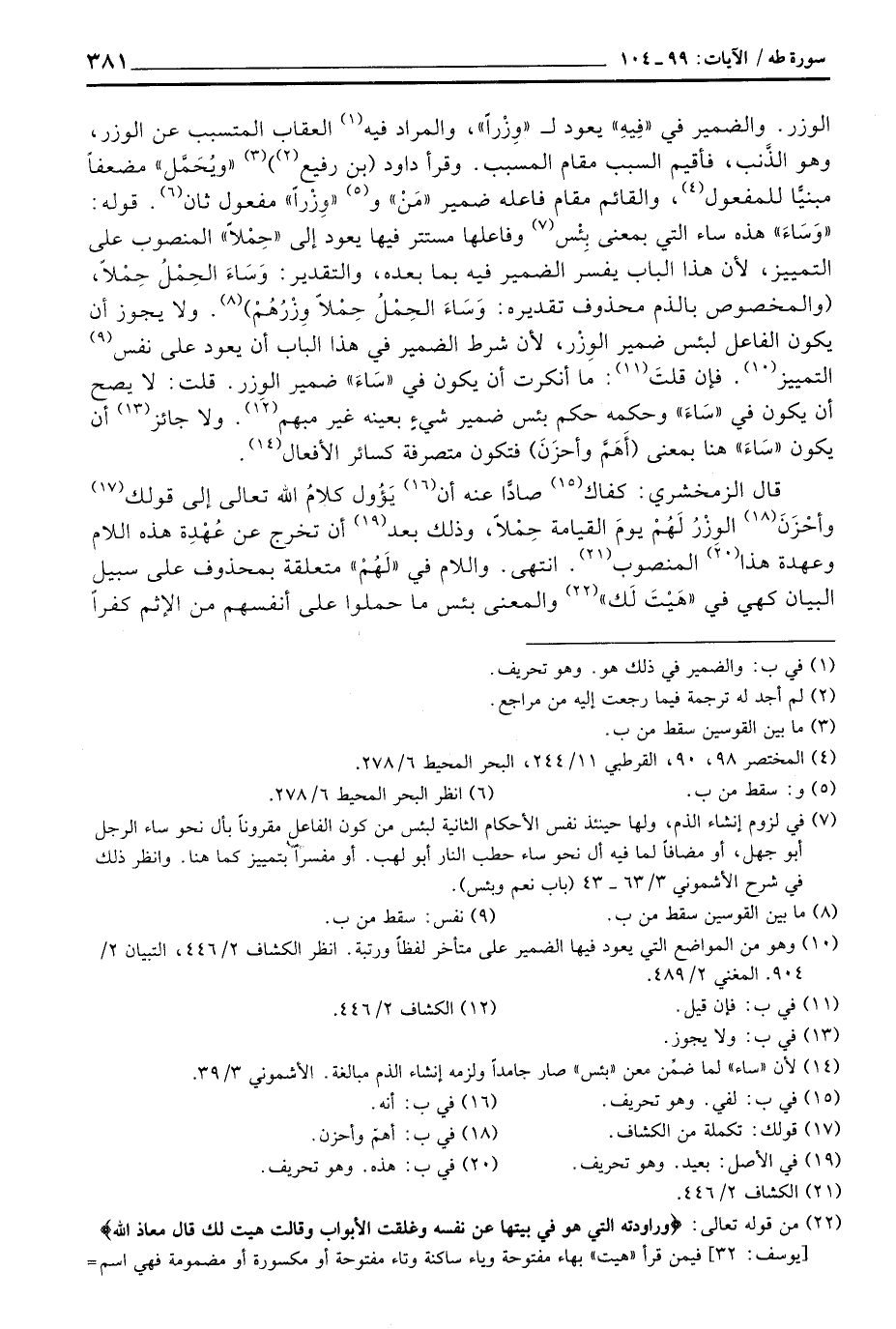 فإن قلتَ: ما أنكرت أن يكون في «سَاءَ» ضمير الوزر. قلت: لا يصح أن يكون في «سَاءَ» وحكمه حكم بئس ضمير شيءٍ بعينه غير مبهم. ولا جائز أن يكون «سَاءَ» هنا بمعنى «أَهَمَّ وأحزَنَ) فتكون متصرفة كسائر الأفعال.