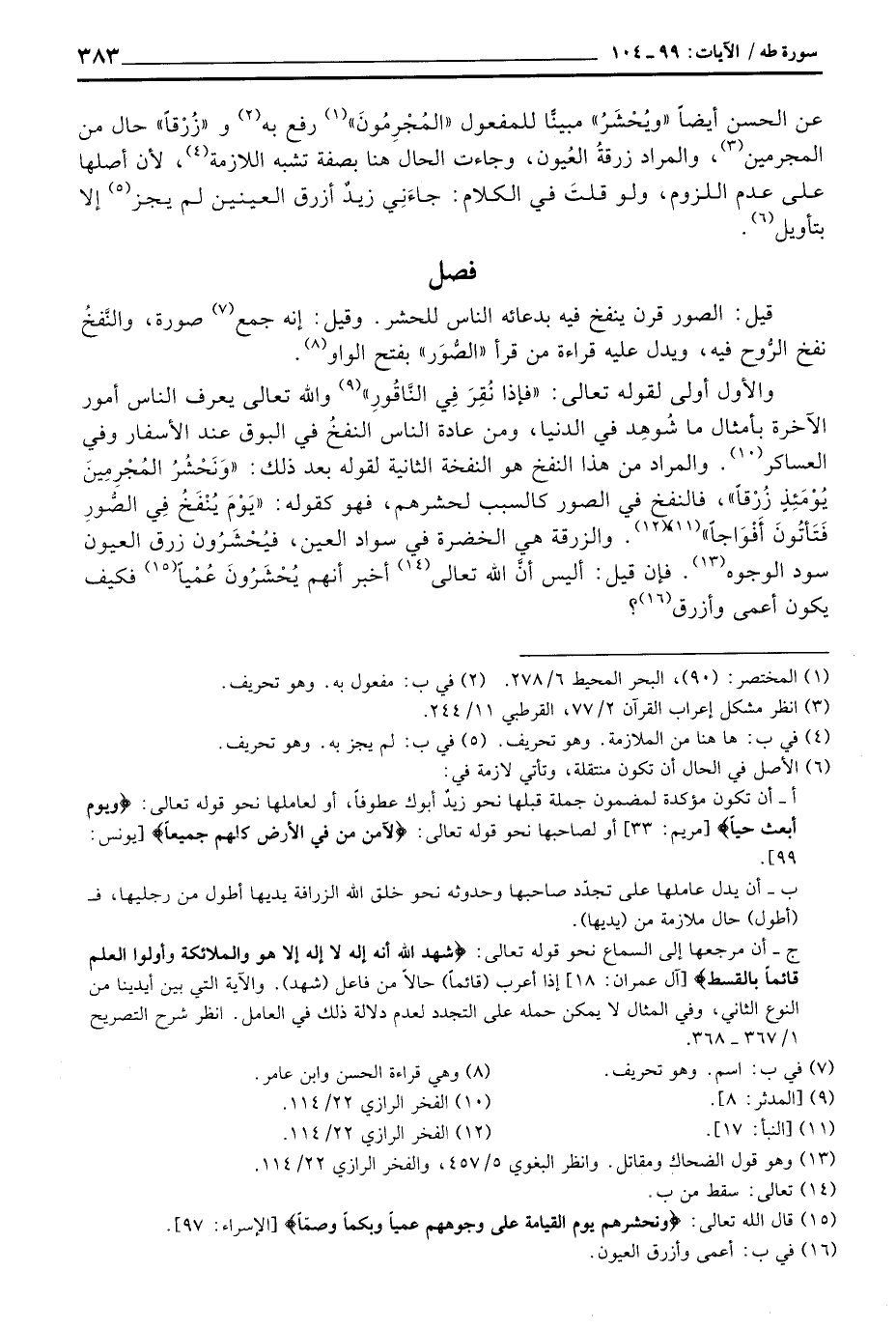عن الحسن أيضاً» ويُحْشَرُ «مبنينَّا للمفعول» المُجْرِمُونَ «رفع به و» زُرْقاً «حال من المجرمين، والمراد زرقةُ العُيون، وجاءت الحال هنا بصفة تشبه اللازمة، لأن أصلها على عدم اللزوم، ولو قلتَ في الكلام: جاءَنِي زيدٌ أزرق العينين لم يجز إلا بتأويل.