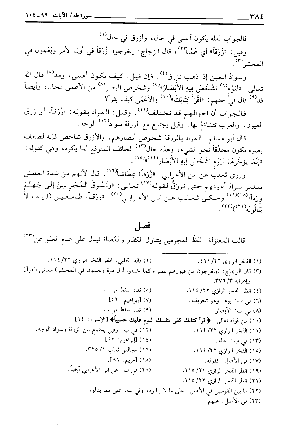 فالجواب أن أحوالهم قد تختلف. وقيل: المراد بقوله: «زُرْقاً» أي زرق العيون، والعرب تتشاءَمُ بها. وقيل يجتمع مع الزرقة سواد الوجه.