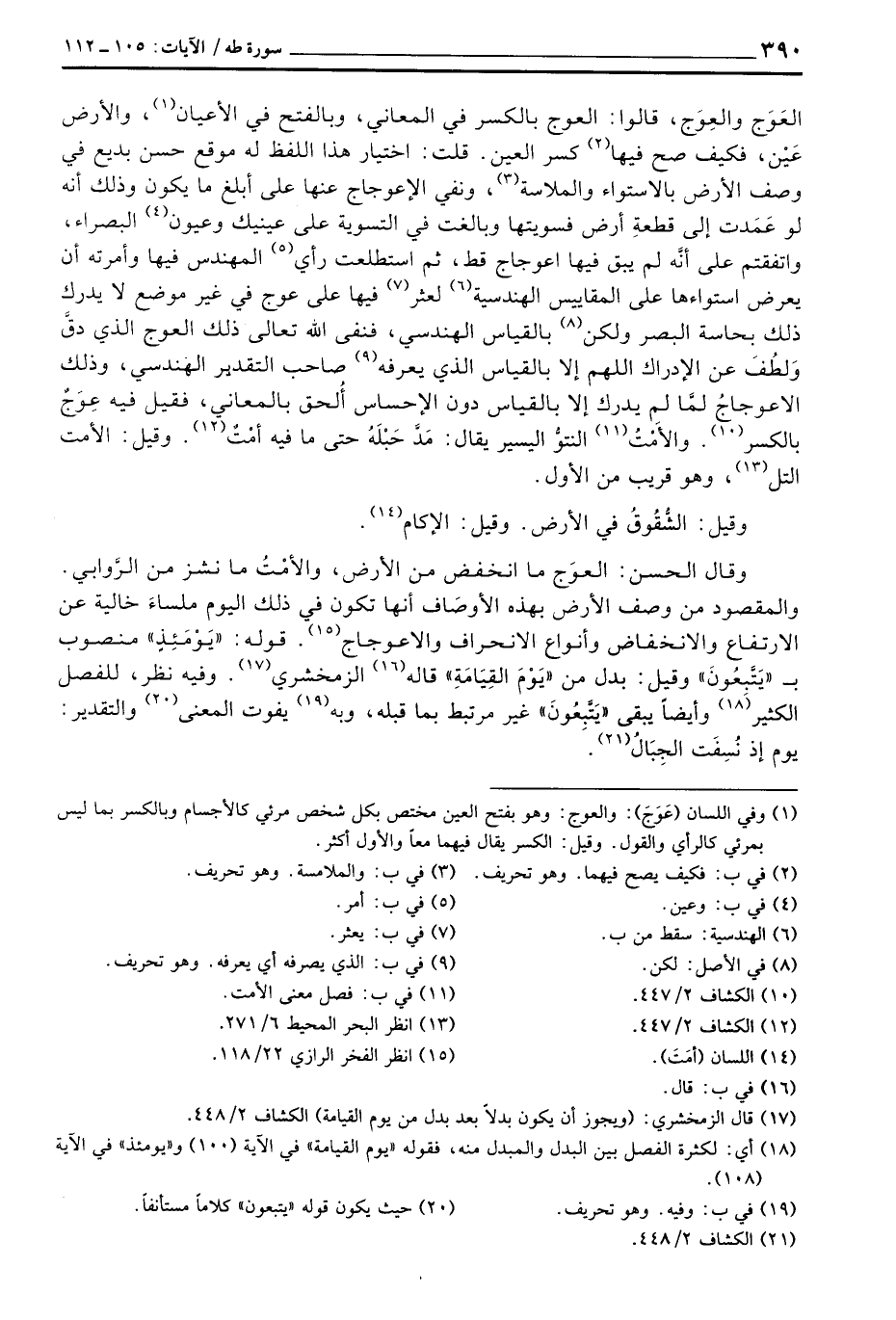 العَوَج والعِوَج، قالوا: العوج بالكسر في المعاني، وبالفتح في الأعيان، والأرض عَيْن، فكيف صح فيها كسر العين. قلت: اختيار هذا اللفظ له موقع حسن بديع في وصف الأرض بالاستواء والملاسة، ونفي الاعوجاج عنها على أبلغ ما يكون وذلك أنه لو عَمَدت إلى قطعةِ أرض فسويتها وبالغت في التسوية على عينيك وعيون البصراء، واتفقتم على أنَّه لم يبقى فيها اعوجاج قط، ثم استطلعت رأي المهندس فيها وأمرته أن يعرض استواءها على المقاييس الهندسية لعثر فيها على عوج في غير موضع لا يدرك ذلك بحاسة البصر ولكن بالقياس الهندسي، فنفى الله تعالى ذلك العوج الذي دقَّ وَلطُفَ عن الإدراك اللهم إلا بالقياس الذي يعرفه صاحب التقدير الهندسي، وذلك الاعوجاجُ لمَّا لم يدرك إلا بالقياس دون الإحساس أُلحق بالمعاني، فقيل فيه عِوَجٌ بالكسر.