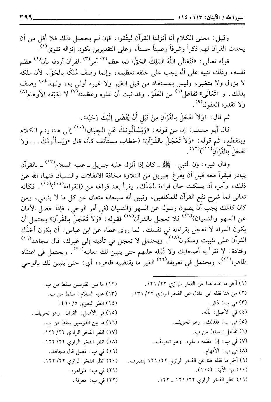 وقال غيره: إن النبي - صَلَّى اللَّهُ عَلَيْهِ وَسَلَّم َ - كان إذا أنزل عليه جبريل - عليه السلام - بالقرآن يبادر فيقرأ معه قبل أن يفرغ جبريل من التلاوة مخافة الانفلات والنسيان فنهاه الله عن ذلك، وأمره أن يسكت حال قراءة المَلَك، يقرأ بعد فراغه من (القراءة) . فكأنه تعالى ما شرح نفع القرآن للمكلفين، وتبين أنه سبحانه متعال عن كل ما لا ينبغي، ومن كان كذلك يجب أن يصون رسوله عن السهو والنسيان (في أمر الوحي، فإذا حصل الأمان عن السهو والنسيان) فلا تعجل بالقرآن فقوله: {وَلاَ تَعْجَلْ بالقرآن} يحتمل أن يكون المراد لا تعجل بقراءته في نفسك. لما روى عطاء عن ابن عباس: أن يكون أخذُك القرآن على تثبيت وسكون. ويحتمل لا تعجل في تأديته إلى غيرك، قال مجاهد وقتادة: لا تقرأ به أصحابك ولا تُمْله عليهم حتى يتبين لك معانيه. ويحتمل في اعتقاد ظاهرهن ويحتمل في تعريفه الغير ما يقتضيه ظاهرهن أي: حتى يتبين لك بالوحي