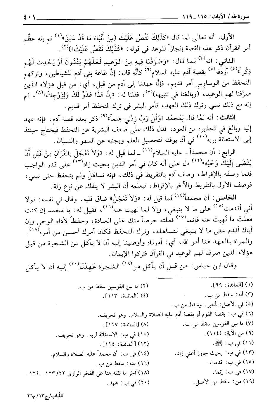 الخامس أن محمداً لما قيل به: «وَلاَ تَعْجَلْ» ضاق قلبه، وقال في نفسه: لولا أني أقدمت على ما لا ينبغي، وإلا لما نهيت عنه، فقيل له: يا محمد إن كنت فعلتَ ما نُهِيتَ عنه فإنما فعلته حرصاً منك على العبادة، وحفظاً لأداء الوحي وإن أباك أقدم على ما لا ينبغي لتساهله، وترك التحفظ فكان أمرك أحسن من أمره. والمراد بالعهد هنا أمر الله، أي: أمرنا وأوصينا إليه أن لا يأكل من الشجرة من قبل هؤلاء الذين صرفنا لهم الوعيد في القرآن فتركوا الإيمان.