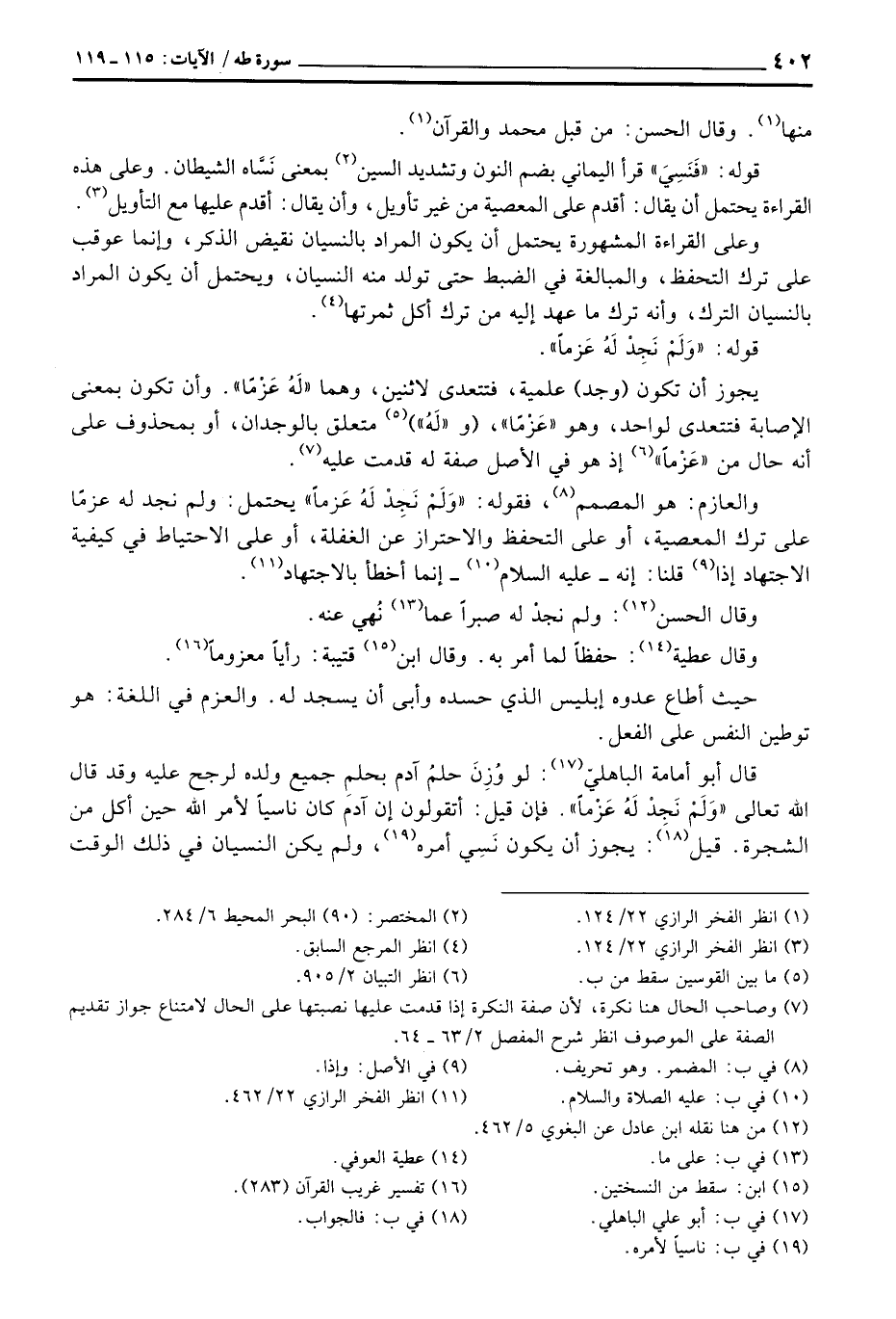 قوله: «فَنَسِيَ» قرأ اليماني بضم النون وتشديد السين بمعنى نَسَّاه الشيطان. وعلى هذه القراءة يحتمل أن يقال: أقدم على المعصية من غير تأويل، وأن يقال: أقدم عليها مع التأويل.
