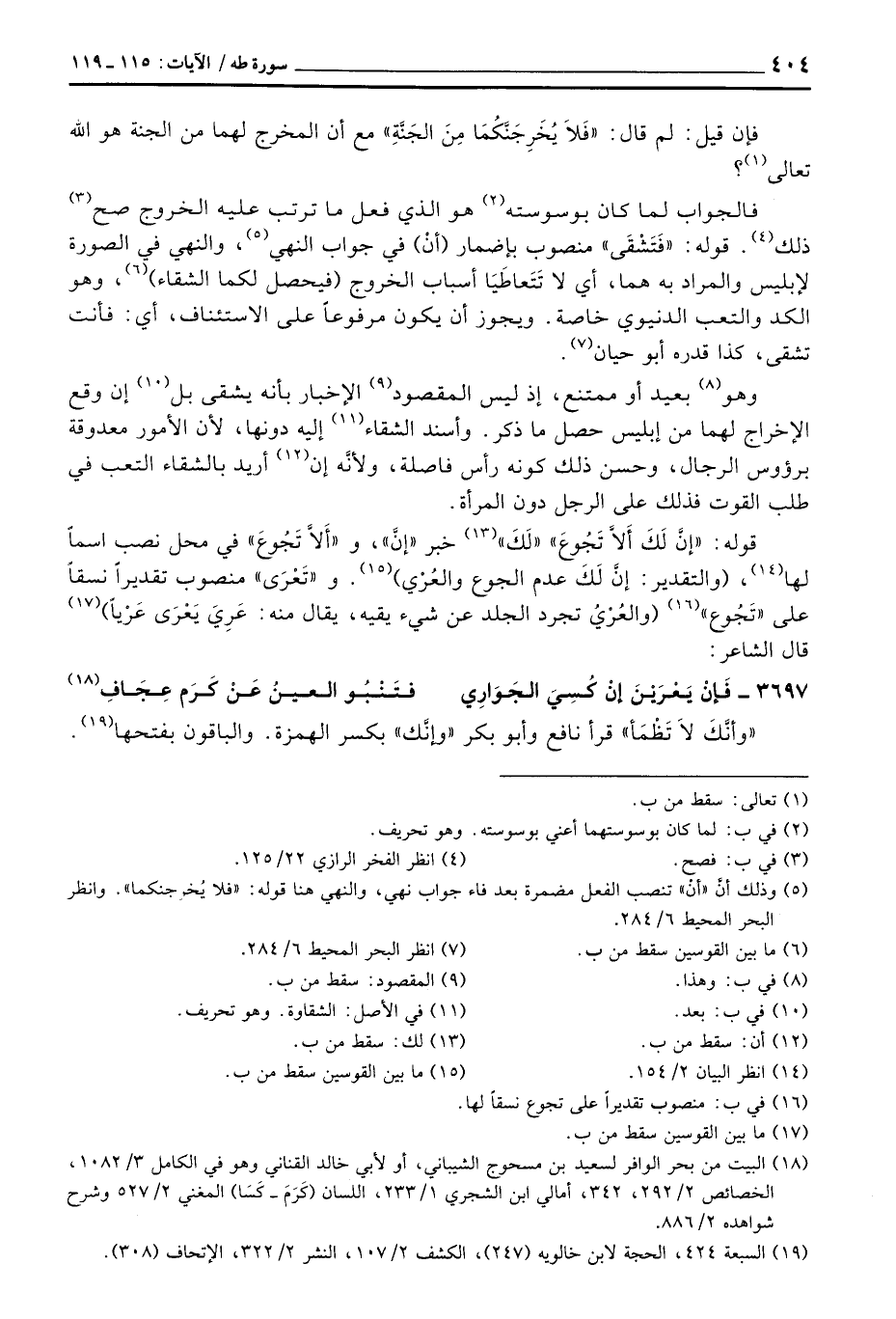 فالجواب لما كان بوسوسته هوة الذي فعل ما ترتب عليه الخروج صح ذلك. قوله: «فَتَشْقَى» منصوب بإضمار (أنْ) في جواب النهي، والنهي في الصورة لإبليس والمراد به هما، أي لا تَتَعَاطَيَا أسباب الخروج (فيحصل لكما الشقاء) ، وهو الكد والتعب الدنيوي خاصة.