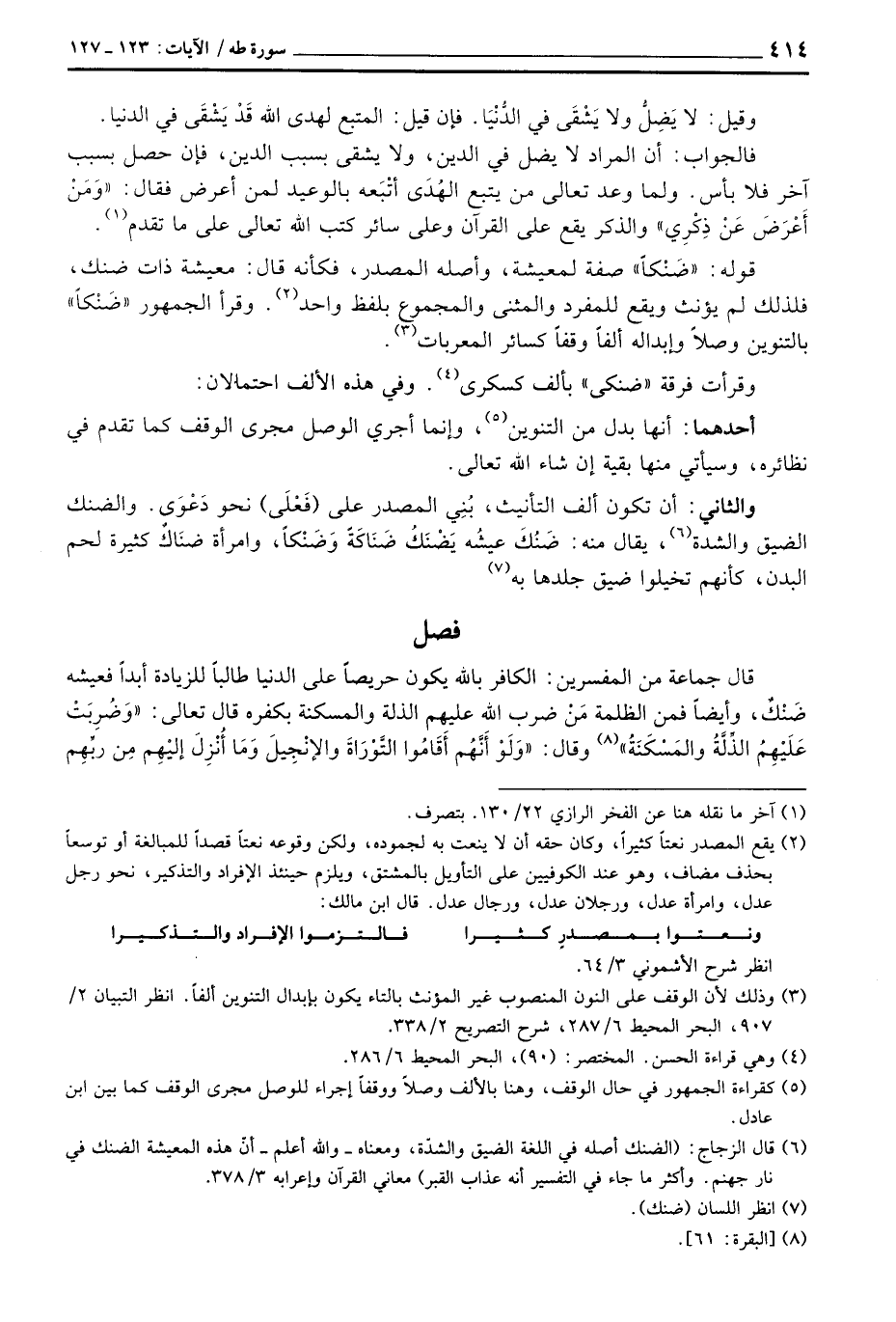 قوله: «ضَنْكاً» صفة لمعيشة، وأصله المصدر، فكأنه قال: معيشة ذات ضنك، فلذلك لم يؤنث ويقع للمفرد والمثنى والمجموع بلفظ واحد. وقرأ الجمهور «ضَنْكاً» بالتنوين وصلاً وإبداله ألفاًَ وقفاً كسائر المعربات.