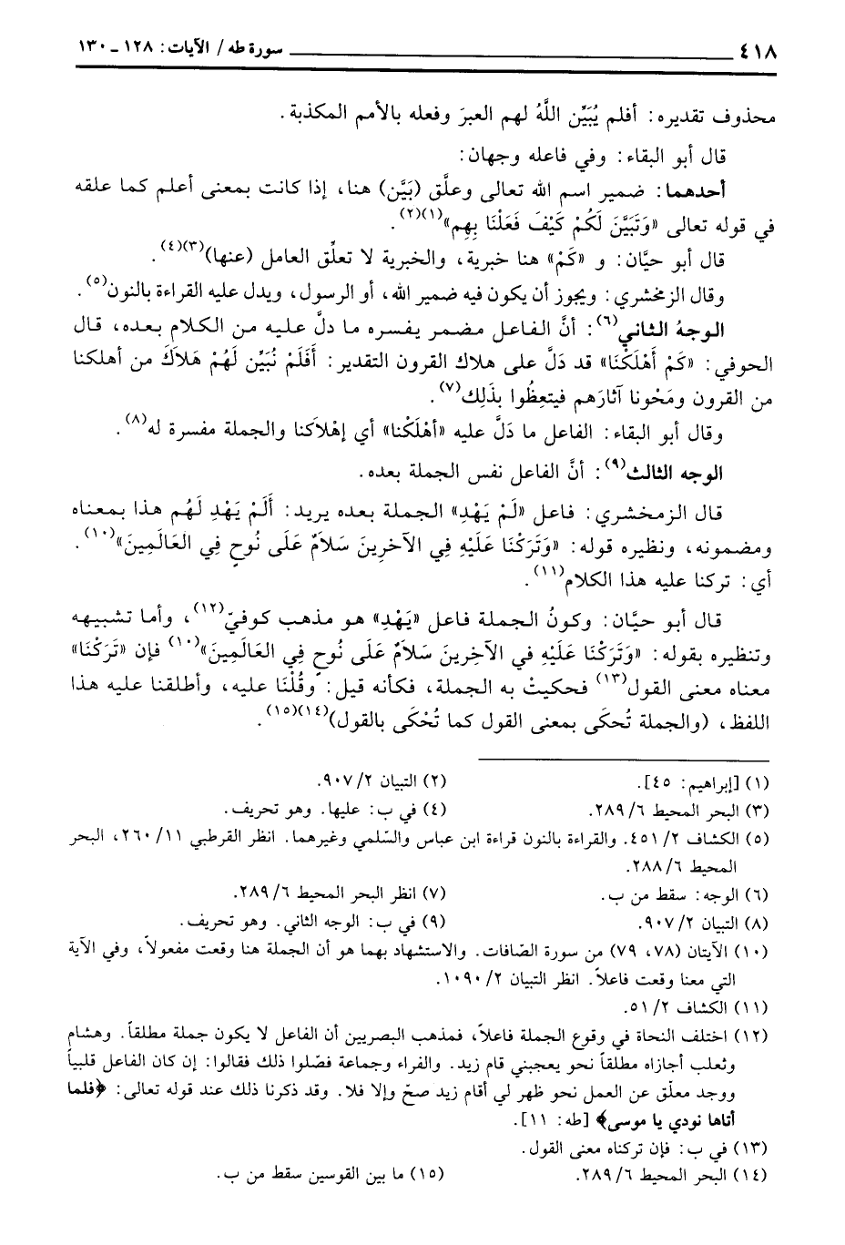 الوجه الثاني: أنَّ الفاعل مضمر يفسره ما دلَّ عليه من الكلام بعده، قال الحوفي: «كَمْ أهْلَكْنَا» قد دَلَِّ على هلاك القرون التقدير: أَفَلَمْ نُبَيِّن لَهُمْ هَلاَكَ من أهلكنا من القرون ومَحْونا آثارَهم فيتعِظُوا بذَلِك.