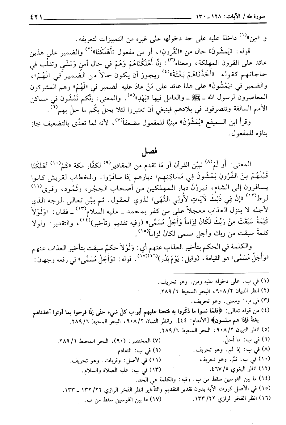 المعنى: أَو لَمْ نبيِّن القرآن أو مَا تقدم من المقادير لكفَّار مكة {كَمْ أَهْلَكْنَا قَبْلَهُمْ مِّنَ القرون يَمْشُونَ فِي مَسَاكِنِهِمْ} ديارهم إذا سافَرُوا. والخطاب لقريش كانوا يسافرون إلى الشام، فيروْنَ ديار المهلكين من أصحاب الحِجْر، وثَمُود، وقرى لوط {إِنَّ فِي ذَلِكَ لآيَاتٍ لأُوْلِي النهى} لذوي العقول. ثم بيَّن تعالى الوجه الذي لأجله لا ينزل العذاب معجلاً على من كفر بمحمد - عليه السلام - فقال: {وَلَوْلاَ كَلِمَةٌ سَبَقَتْ مِن رَّبِّكَ لَكَانَ لِزَاماً وَأَجَلٌ مُّسَمًّى} (وفيه تقديم وتأخير) ، والتقدير: ولولا كلمةٌ سبقت من ربك وأجل مسمى لكانَ لزاماً.