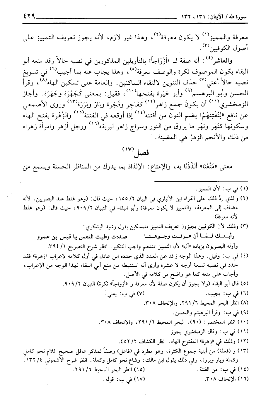 والعاشر: أنه صفة ل» أزْوَاجاً «بالتأويلين المذكورين في نصبه حالاً وقد منعه أبو البقاء يكون الموصوف نكرة والوصف معرفة، وهذا يجاب عنه بما أجيب في تسويغ نصبه حالاً أعني حذف التنوين للالتقاء الساكنين. والعامة على تسكين الهاء، وقرأ الحسن وأبو البرهسم وأبو حَيْوة بفتحها، فقيل: بمعنى كَجَهْرَة وجَهْرَة. وأجاز الزمخشري أن يكونَ جمع زاهر كفَاجِر وفَجَرة وبَارّ وبَرَرَة وروى الأصمعي عن نافع» لِنُفْتِنهُمْ «بضم النون من أقتنه إذا اوقعه في الفتنة والزَّهْرة بفتح الحاء وسكونها كَنَهر ونهْر ما يروق من النور وسراج زاهر لبريقه ورجل أزهر وامرأة زهراء من ذلك والأنجم الزهرُ هي المضيئة.