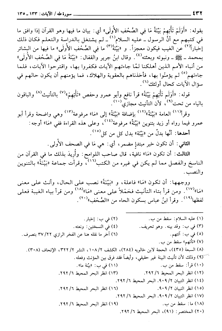 ووجهها: أن تكون " ما " فاعلة، و" بينة " نصب على الحال، وأنث على معنى " ما ". ومن قرأ بتاء التأنث فحملا على معنى " ما " ومن قرأ بياء الغيبة فعلى لفظها. وقرأ ابن عباس بسكون الحاء من " الصحف ".