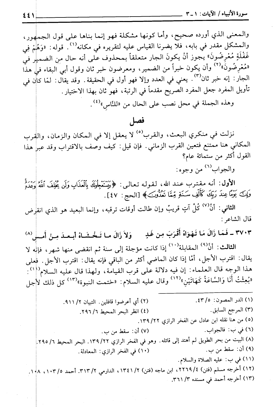 الثالث: أنَّ المقابلة إذا كانت مؤجلة إلى سنة ثم انقضى منها شهر، فإنه لا يقال: اقترب الأجل، أمَّا إذا كان الماضي أكثر من الباقي فإنه يقال: اقترب الأجل. فعلى هذا الوجه قال العلماء: إن فيه دلالة على قرب القيامة، ولهذا قال عليه السلام: «بُعِثْتُ أَنَا وَالسَّاعَةُ كَهَاتَيْنِ» وقال عليه السلام: «ختمت النبوة» كل ذلك لأجل