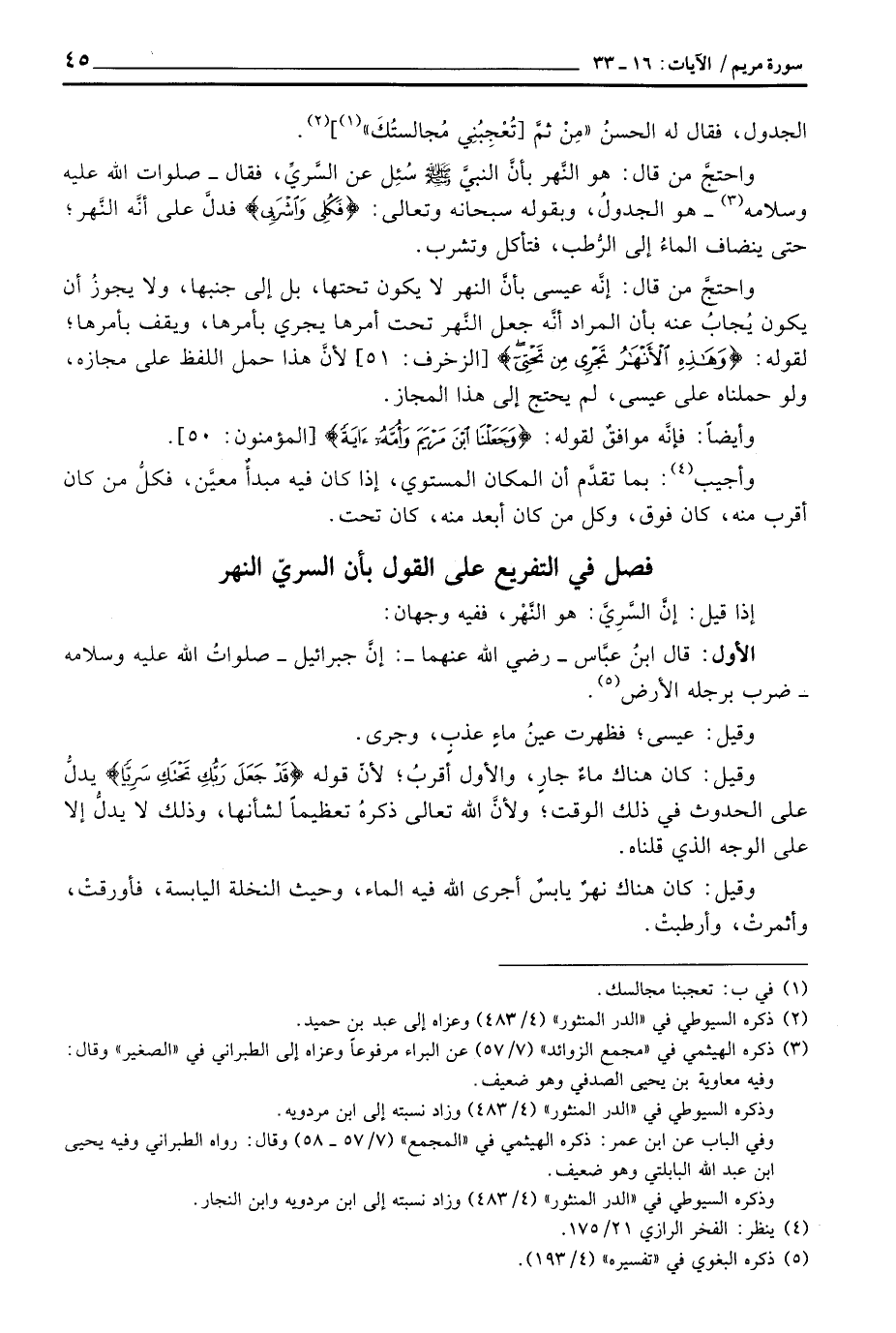 واحتجَّ من قال: هو النَّهر «بأنَّ النبيَّ صَلَّى اللَّهُ عَلَيْهِ وَسَلَّم َ سُئِلَ عن السَّريِّ، فقال - صلوات الله عليه وسلامه - هو الجدولُ» وبقوله سبحانه وتعالى: {فَكُلِي واشربي} فدلَّ على أنَّه على أنَّه النَّهر؛ حتى ينضاف الماءُ إلى الرُّطب، فتأكل وتشرب.