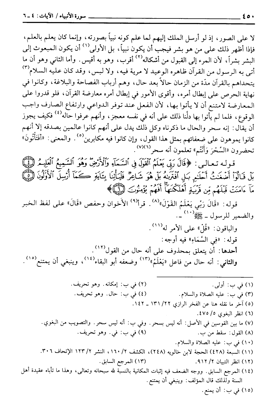 لا على الصور، إذ لو أرسل الملك إليهم لما علم كونه نبياً بصورته، وإنما كان يعلم بالعلم، فإذا أظهر ذلك على من هو بشر فيجب أن يكون نبياً، بل الأولى أن يكون المبعوث إلى البشر بشراً، لأن المرء إلى القبول من أشكاله أقرب، وهو به أقيس. وأما الثاني وهو أن ما أتى به الرسول من القرآن ظاهره الوعيد لا مرية فيه، ولا لبس، وقد كان عليه السلام يتحداهم بالقرآن مدة من الزمان حالاً بعد حال، وهم أرباب الفصاحة والبلاغة، وكانوا في نهاية الحرص على إبطال أمره، وأقوى الأمور في إبطال أمره معارضة القرآن، فلو قدروا على المعارضة لامتنع أن لا يأتوا بها، لأن الفعل عند توفر الدواعي وارتفاع الصارف واجب الوقوع، فلما لم يأتوا بها، لأن الفعل عند توفر الدواعي وارتفاع الصارف واجب الوقوع، فلما لم يأتوا بها دلَّنا ذلك على أنه في نفسه معجز، وأنهم عرفوا حاله فكيف يجوز أن يقال: إنه سحر والحال ما ذكرناه وكل ذلك يدل على انهم كانوا عالمين بصدقه إلا أنهم كانوا يوهمون على ضعفائهم بمثل هذا القول، وإن كانوا فيه مكابرين. والمعنى: «أفَتَأْتُونَ» تحضرون «السِّحْرَ وَأَنْتُم» تعلمون أنه سحر.