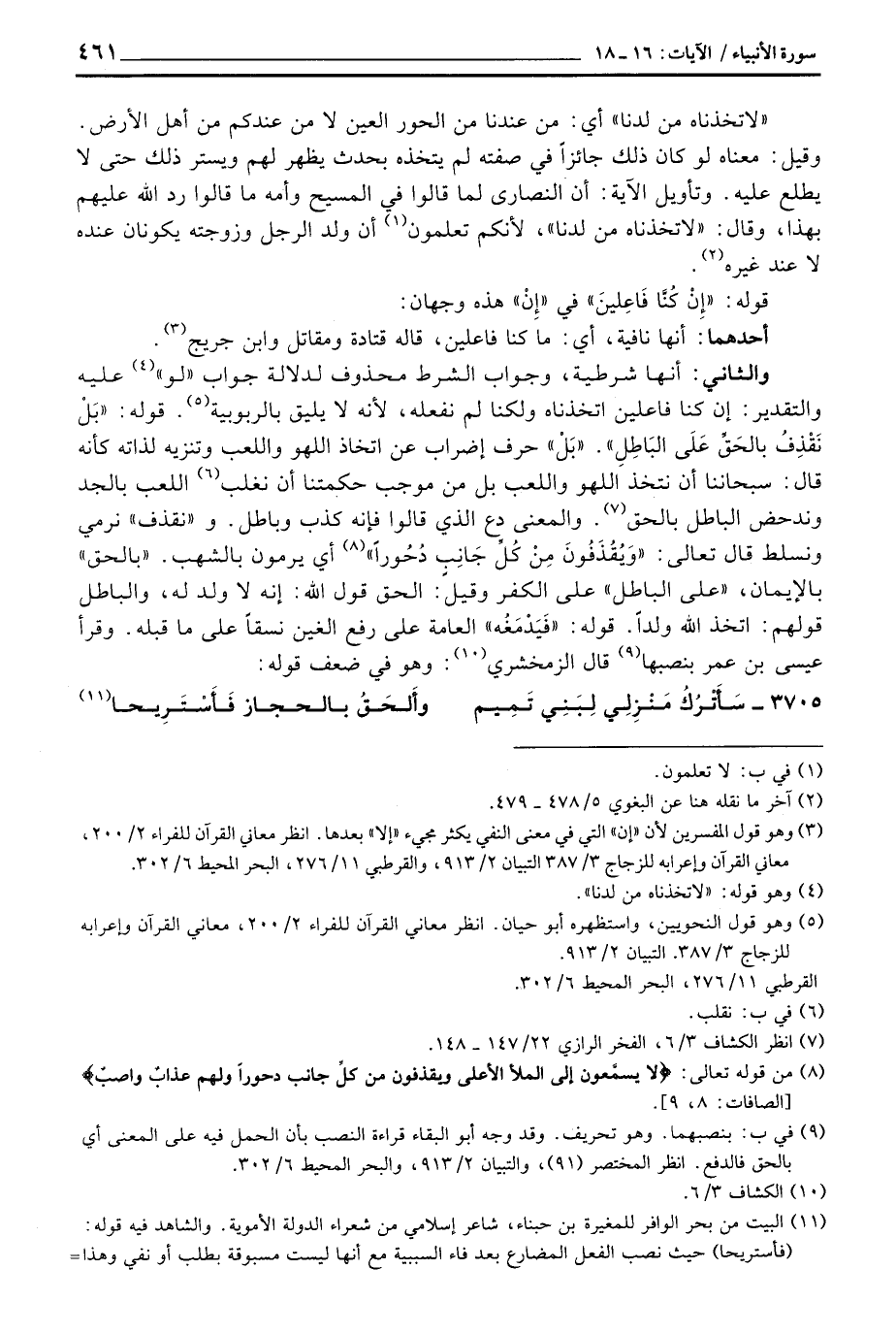 والثاني: أنها شرطية، وجواب الشرط محذوف لدلالة جواب «لو» عليه والتقدير: إن كنا فاعلين اتخذناه ولكنا لم نفعله، لأنه لا يليق بالربوبية. قوله: {بَلْ نَقْذِفُ بالحق عَلَى الباطل} . «بَل» حرف إضراب عن اتخاذ اللهو واللعب وتنزيه لذاته كأنه قال: سبحاننا أن نتخذ اللهو واللعب بل من موجب حكمتنا أن نغلب اللعب بالجد وندحض الباطل بالحق.