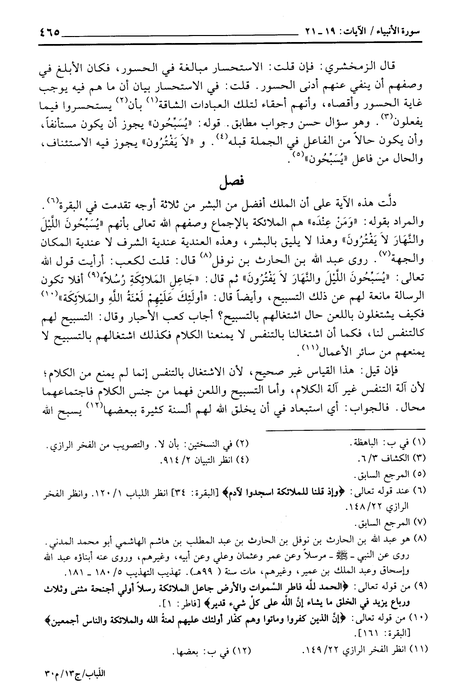 دلَّت هذه الآية على أن الملك أفضل من البشر من ثلاثة أوجه تقدمت في البقرة. والمراد بقوله: «وَمَنْ عِنْدَهُ» هم الملائكة بالإجماع وصفهم الله تعالى بأنهم {يُسَبِّحُونَ الليل والنهار لاَ يَفْتُرُونَ} وهذا لا يليق بالبشر، وهذه العندية عندية الشرف لا عندية المكان والجهة. روى عبد الله بن الحارث بن نوفل قال: قلت لكعب: أرأيت قول الله تعالى: {يُسَبِّحُونَ الليل والنهار لاَ يَفْتُرُونَ} ثم قال: {جَاعِلِ الملائكة رُسُلاً} [فاطر: 1] أفلا تكون الرسالة مانعة لهم عن هذا التسبيح، وأيضاً قال: {أُولَئِكَ عَلَيْهِمْ لَعْنَةُ الله والملاائكة} [البقرة: 161] فكيف يشتغلون باللعن حال اشتغالهم بالتسبيح؟ أجاب كعب الأحبار وقال: التسبيح لهم كالتنفس لنا، فكما أن اشتغالنا بالتنفس لا يمنعنا الكلام فكذلك اشتغالهم بالتسبيح لا يمنعهم من سائر الأعمال.