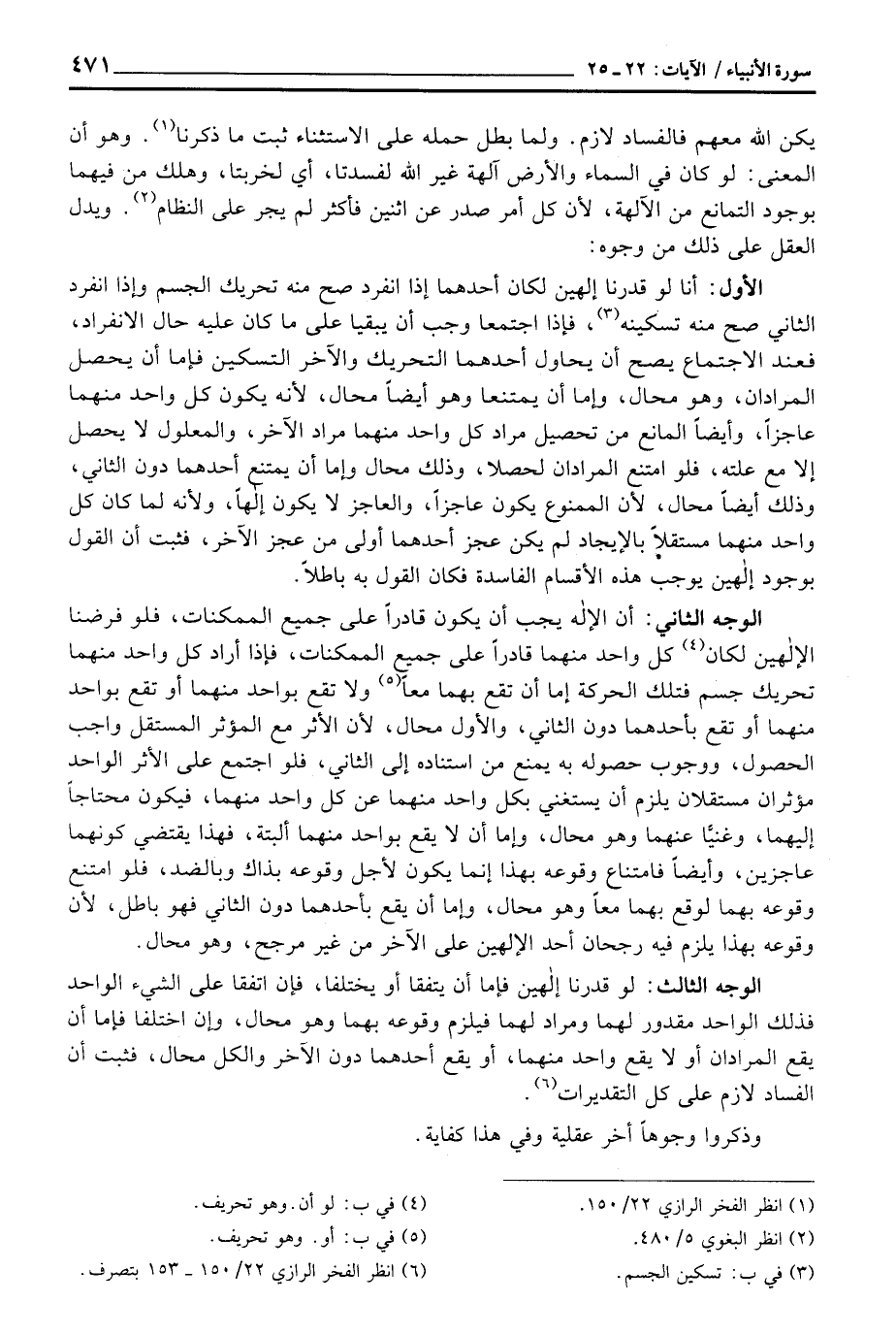 الوجه الثاني: أن الإله يجب أن يكون قادراً على جميع الممكنات، فلو فرضنا الإلهين لكان كل واحد منهما قادراً على جميع الممكنات، فإذا أراد كل واحد منهما تحريك جسم فتلك الحركة إما أن تقع بهما معاً ولا تقع بواحد منهما أو تقع بواحد منهما أو تقع بأحدهما دون الثاني، والأول محال، لأن الأثر مع المؤثر المستقل واجب الحصول، ووجوب حصوله به يمنع من استناده إلى الاثني، فلو اجتمع على الأثر الواحد مؤثران مستقلان يلزم أن يستغني بكل واحد منهما عن كل واحد منهما، فيكون محتاجاً إليهما، وغنيَّا عنهما وهو محال، وإما أن لا يقع بواحد منهما ألبتة، فهذا يقتضي كونهما عاجزين، وأيضاً فامتناع وقوه بهذا إنما يكون لأجل وقوعه بذاك وبالضد، فلو امتنع وقوعه بهما معاً وهو محال، وإما أن يقع بأحدهما دون الثاني فهو باطل، لأن وقوعه بهما لوقع بهما معاً وهو محال، وإما أن يقع بأحدهما دون الثاني فهو باطل، لأن وقوعه بهذا يلزم فيه رجحان أحد الإلهين على الآخر من غير مرجح، وهو محال.