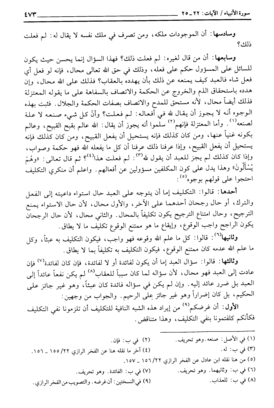 وسابعها: أن من قال لغيره: لم فعلت ذلك؟ فهذا السؤال إنما يحسن حيث يكون للسائل على المسؤول حكم على فعله، وذلك في حق الله تعالى محال، فإنه لو فعل أي فعل شاء فالعبد كيف يمنعه عن ذلك بأن يهدده بالعقاب؟ فذلك على الله محال، وإن هذه باستحقاق الذم والخروج عن الحكمة والاتصاف بالسفاهة على ما يقوله المعتزلة فذلك أيضاً محال، لأنه مستحق للمدح والاتصاف بصفات الحكمة والجلال. فثبت بهذه الوجوه أنه لا يجوز أن يقال لله في أفعاله: لم فعلت؟ وإنّ كل شيء صنعه لا علة لصنعه. وأما المعتزلة فإنهم سلموا أنه يجوز أن يقال: الله عالم بقبح القبيح، وعلام بكونه غنياً عنها، ومن كان كذلك لم يجز للعبد أن يقول لله: لم فعلت هذا؟ ثم قال تعالى: «وهُمْ يُسْأَلُونَ» وهذا يدل على كون المكلفين مسؤولين عن أفعالهم. واعلم أن منكري التكليف احتجوا على قولهم بوجوه: