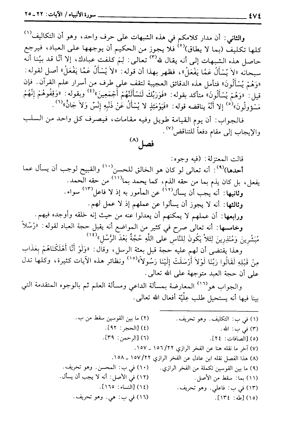 والثاني: أن مدار كلامكم في هذه الشبهات على حرف واحد، وهو أن التكاليف كلها تكليف (بما لا يطاق) فلا يجوز من الحكيم أن يوجهها على العباد، فيرجح حاصل هذه الشبهات إلى أنه يقال لله تعالى: لِمَ كلفت عبادك، إلا أنَّا قد بيَّنا أنه سبحانه {لاَ يُسْأَلُ عَمَّا يَفْعَلُ} ، فظهر بهذا أن قوله: {لاَ يُسْأَلُ عَمَّا يَفْعَلُ} أصل لقوله: {وَهُمْ يُسْأَلُونَ} فتأمل هذه الدقائق العجيبة لتقف على طرف من أسرار علم القرآن. فإن قيل: {وَهُمْ يُسْأَلُونَ} متأكد بقوله: {فَوَرَبِّكَ لَنَسْأَلَنَّهُمْ أَجْمَعِينَ} [الحجر: 92] وبقوله: {وَقِفُوهُمْ إِنَّهُمْ مَّسْئُولُونَ} [الصافات: 24] إلا أَنَّهُ يناقضه قوله: {فَيَوْمَئِذٍ لاَّ يُسْأَلُ عَن ذَنبِهِ إِنسٌ وَلاَ جَآنٌّ} [الرحمن: 39] .