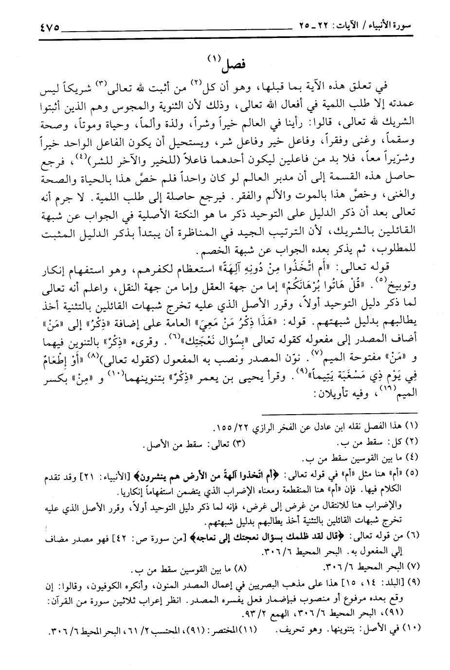 قوله تعالى: {أَمِ اتخذوا مِن دُونِهِ آلِهَةً} استعظام لكفرهم، وهو استفهام إنكار وتوبيخ. {قُلْ هَاتُواْ بُرْهَانَكُمْ} إما من جهة العقل وإما من جهة النقل، واعلم أنه تعالى لما ذكر دليل التوحيد أولاً، وقرر الأصل، الذي عليه تخرج شبهات القائلين بالتثنية أخذ يطالبهم بدليل شبهتهم. قوله: {هذا ذِكْرُ مَن مَّعِيَ} العامة على إضافة «ذِكْرُ» إلى «مَنْ» أضاف المصدر إلى مفعوله كقوله تعالى «بِسُؤَالِ نَعْجَتِك» . وقرئ «ذِكْرٌ» بالتنوين فيهما و «مَنْ» مفتوحة الميم. نوّن المصدر ونصب به المفعول (كقوله تعالى) {أَوْ إِطْعَامٌ فِي يَوْمٍ ذِي مَسْغَبَةٍ يَتِيماً} [البلد: 14، 15] . وقرأ يحيى بن يعمر «ذِكْرٌ» بتنوينهما و «مِنْ» بكسر الميم، وفيه تأويلان: