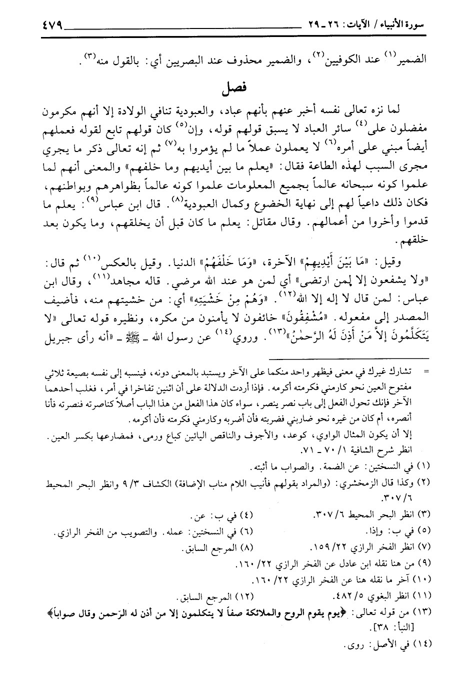 وقيل: {مَا بَيْنَ أَيْدِيهِمْ} الآخرة، «وَمَا خَلْفَهُمْ» الدنيا. وقيل بالعكس ثم قال: {وَلاَ يَشْفَعُونَ إِلاَّ لِمَنِ ارتضى} أي لمن هو عند الله مرضي. قاله مجاهد، وقال ابن عباس: لمن قال لا إله إلا الله. {وَهُمْ مِّنْ خَشْيَتِهِ} أي: من خشيتهم منه، فأضيف المصدر إلى مفعوله. «مُشْفقُونَ» خائفون لا يأمنون من مكره، ونظيره قوله تعالى {لاَّ يَتَكَلَّمُونَ إِلاَّ مَنْ أَذِنَ لَهُ الرحمن} [النبأ: 38] .