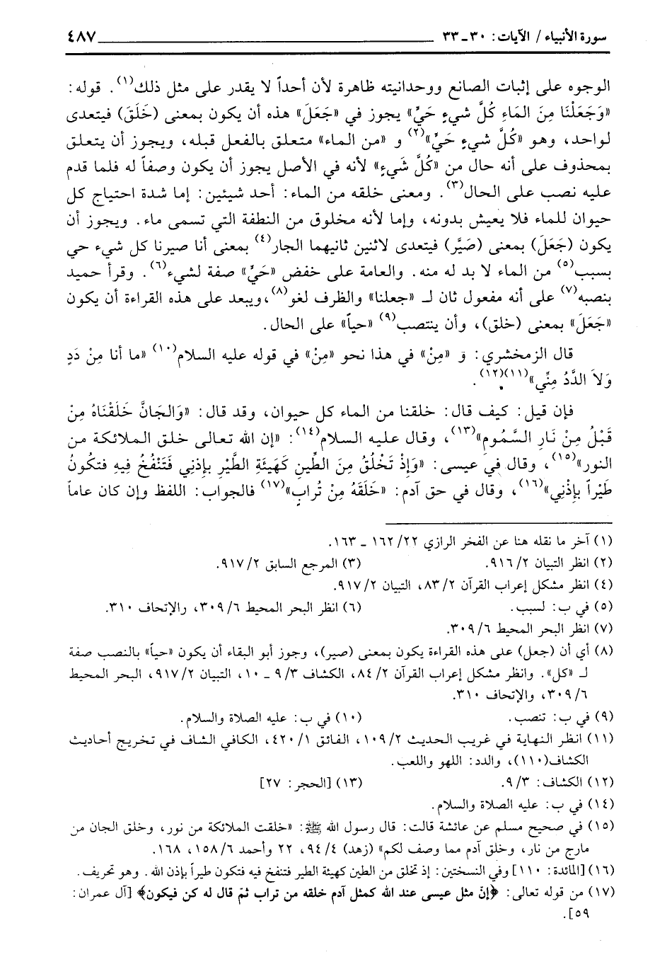 الوجوه على إثبات الصانع ووحدانيته ظاهرة لأن أحداً لا يقدر على مثل ذلك. قوله: {وَجَعَلْنَا مِنَ المآء كُلَّ شَيْءٍ حَيٍّ} يجوز في «جَعَلَ» هذه أن يكون بمعنى «خَلَقَ» فيتعدى لواحد، وهو {كُلَّ شَيْءٍ حَيٍّ} و «من الماء» متعلق بالفعل قبله، ويجوز أن يتعلق بمحذوف على أنه من «كُلَّ شَيْءٍ» لأنه في الأصل يجوز أن يكون وصفاً له فلما قدم عليه نصب على الحال. ومعنى خلقه من الماء: أحد شيئين: إما شدة احتياج كل حيوان للماء فلا يعيش بدونه، وإما لأنه مخلوق من النطفة التي تسمى ماء. ويجوز أن يكون (جَعَلَ) بمعنى (صَيَّرَ) فيتعدى رثنين ثانيهما الجار بمعنى أنا صيرنا كل شيء حي بسبب من الماء لا بد له منه. والعامة على خفض «حَيٍّ» صفة لشيء. وقرأ حميد بنصبه على أنه مفعول ثان ل «جعلنا» والظرف لغو، ويبعد على هذه القراءة أن يكون «جَعَلَ» بمعنى (خلق) ، وأن ينتصب «حياً» على الحال.
