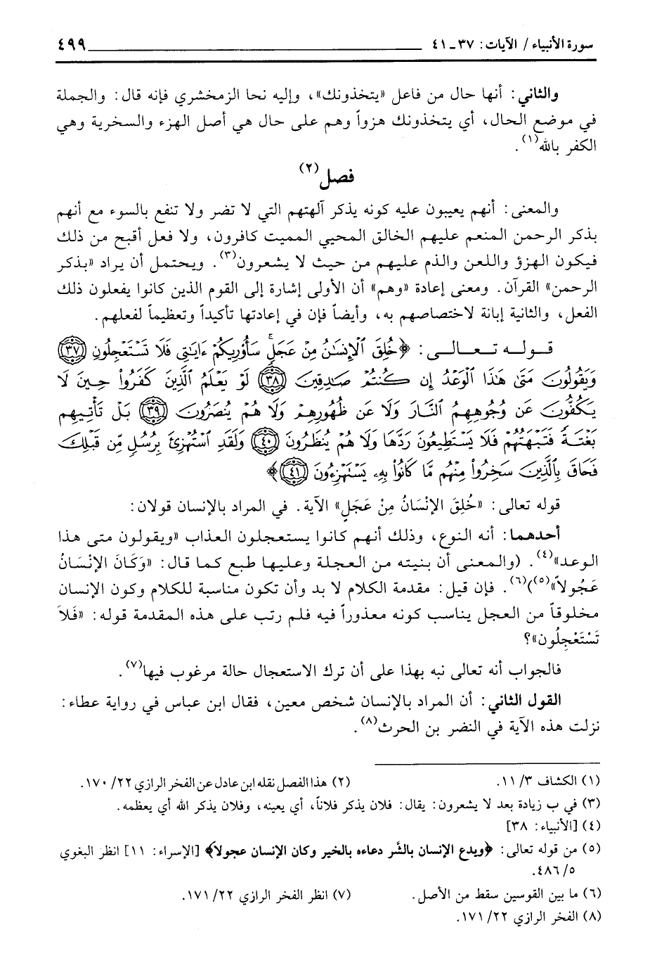 أحدهما: أنه النوع، وذلك أنهم كانوا يستعجلون العذاب {وَيَقُولُونَ متى هذا الوعد} . (والمعنى أن ينبته من العجلة وعليها طبع كما قال: {وَكَانَ الإنسان عَجُولاً} [الإسراء: 11] . فإن قيل: مقدمة الكلام لا بد وأن تكون مناسبة للكلام وكون الإنسان مخلوقاً من العجل يناسب كونه معذوراً فيه فلم رتب على هذه المقدمة قوله: {فَلاَ تَسْتَعْجِلُونِ} ؟