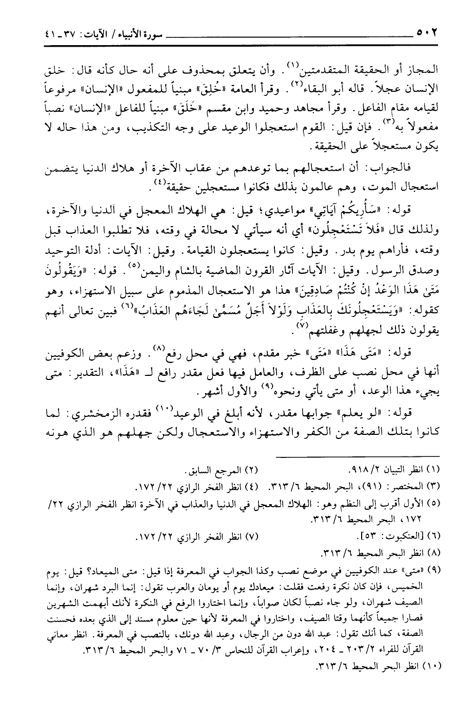 المجاز أو الحقيقة المتقدمتين. وأن يتعلق بمحذوف على أنه حال كأنه قال: خلق الإنسان عجلاً. قاله أبو البقاء. وقرأ العامة «خُلِقَ» مبينياً للمفعول «الإنسان» مرفوعاً لقيامه مقام الفاعل. وقرأ مجاهد وحميد وابن مقسم «خَلَقَ» مبنياً للفاعل «الإنسان» نصباً مفعولاً به. فإن قيل: القوم استعجلوا الوعيد على وجه التكذيب، ومن هذا حاله لا يكون مستعجلاً على الحقيقة.