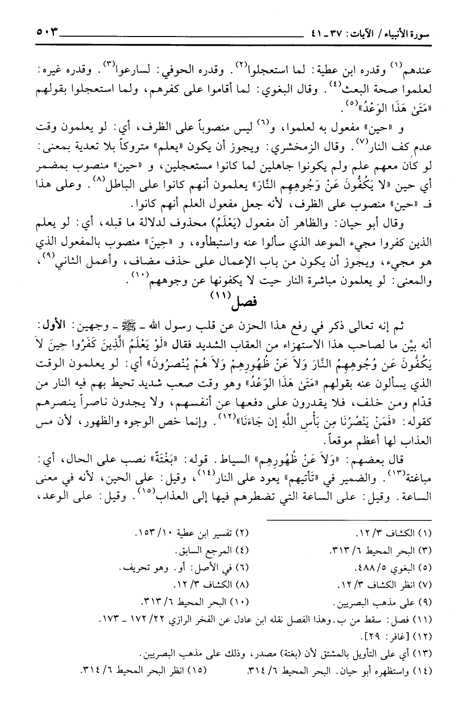 وقال أبو حيان: والظاهر أن مفعول «يَعْلَمُ) محذوف لدلالة ما قبله، أي: لو يعلم الذين كفروا مجيء الموعد الذي سألوا عنه واستبطأوه، و» حِينَ «منصوب بالمفعول الذي هوة مجيء، ويجوز أن يكون من باب الإعمال على حذف مضاف، وأعمل الثاني، والمعنى: لو يعلمون مباشرة النار حيت لا يكفونها عن وجوههم.