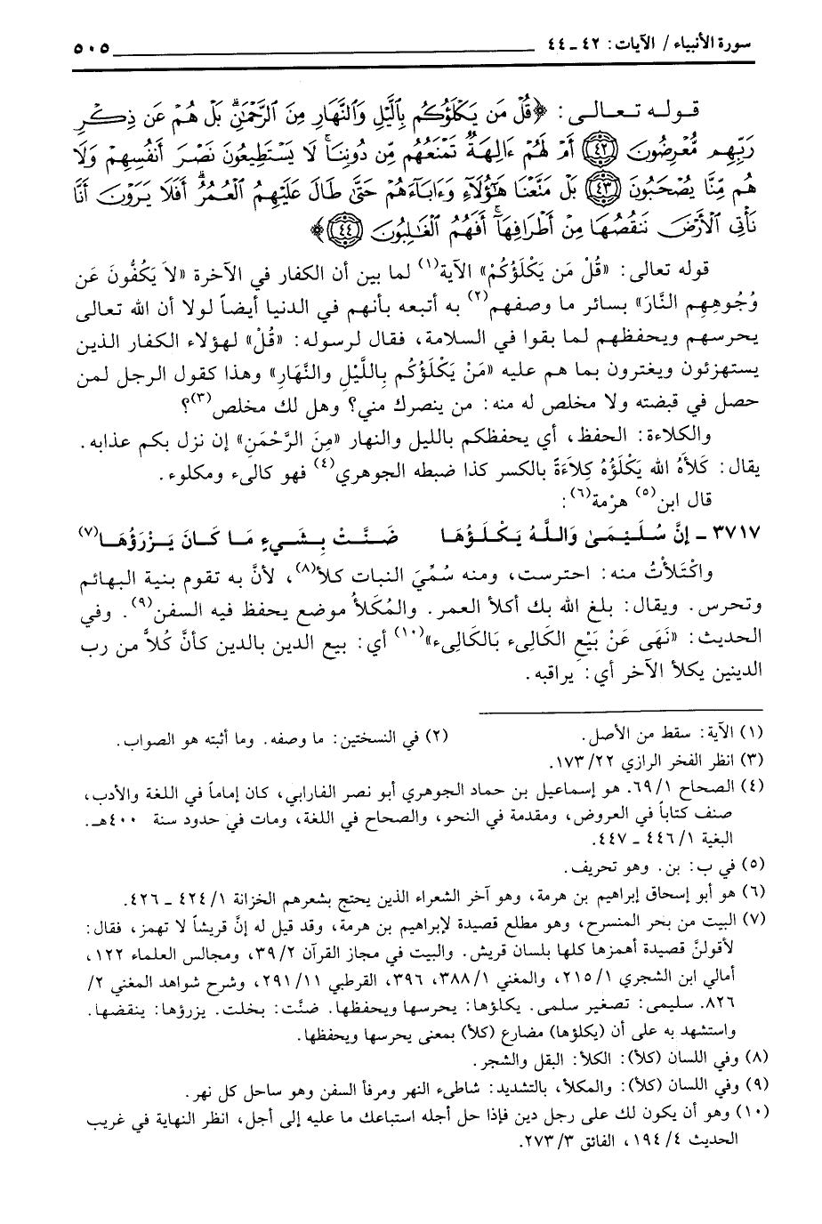 قوله تعالى: {قُلْ مَن يَكْلَؤُكُم} الآية لما بين أن الكفار في الآخرة {لاَ يَكُفُّونَ عَن وُجُوهِهِمُ النار} بسائر ما وصفهم به أتبعه بأنهم في الدنيا أيضاً لولا أن الله تعالى يحرسهم ويحفظهم لما بقوا في السلاكة، فقال لرسوله: طقُلْ «لهؤلاء الكفار الذين يستهزئون ويغترون بما هم عليه {مَن يَكْلَؤُكُم بالليل والنهار} وهذا كقول الرجل لمن حصل في قبضته ولا مخلص له منه: من ينصرك مني؟ وهل لك مخلص؟