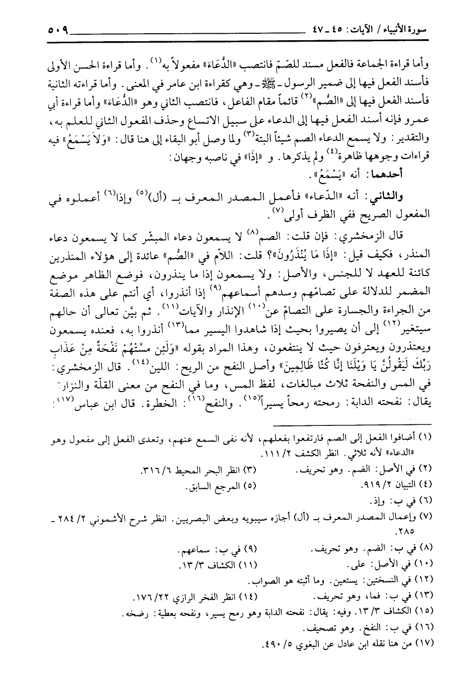 قال الزمخشري: فإن قلت: الصم لا يسمعون دعاء المبشّر كما لا يسمعون دعاء المنذر، فكيف قيل: {إِذَا مَا يُنذَرُونَ} ؟ قلت: اللاّم في «الصُّم» عائدة إلى هؤلاء المنذرين كائنة للعهد لا للجنس، والأصل: ولا يسمعون إذا ما ينذرون، فوضع الظاهر موضع المضمر للدلالة على تصامّهم وسدهم أسماعهم إذا انذروا، أي أنتم على هذه الصفة من الجراءة والجسارة على التصامّ عن الإنذارات والآيات. ثم بيَّن تعالى أن حالهم سيتغير إلى أن يصيروا بحيث إذا شاهدوا اليسير مما أنذروا به، فعنده يسمعون ويعتذرون ويعترفون حيث لا ينتفعون، وهذا المراد بقوله: {وَلَئِن مَّسَّتْهُمْ نَفْحَةٌ مِّنْ عَذَابِ رَبِّكَ لَيَقُولُنَّ ياويلنآ إِنَّا كُنَّا ظَالِمِينَ} وأصل النفح من الريح: اللين. قال الزمخشري: في المس والنفحة ثلاث مبالغات، لفظ المس، وما في النفح من معنى القلّة والنزار يقال: نفحته الدابة: رمحته رمحاً يسيراً.