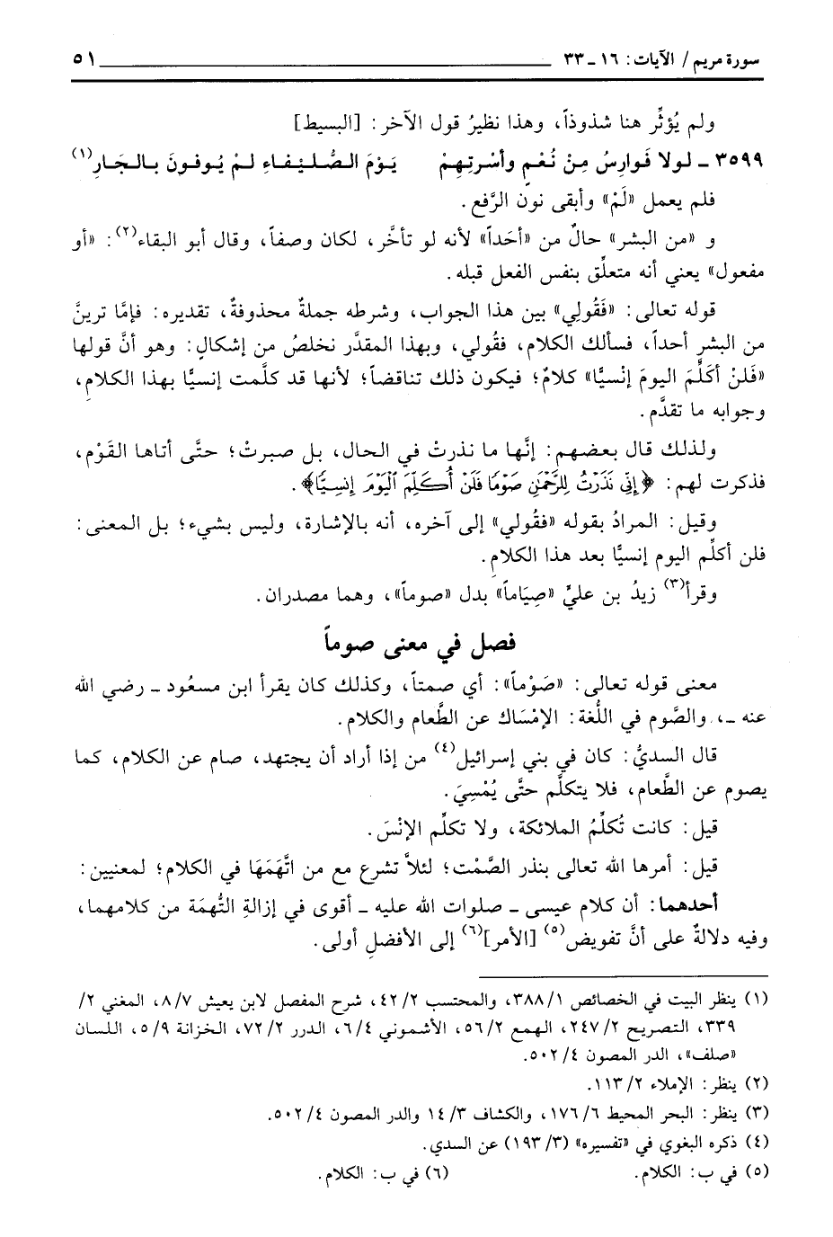 وقيل: المرادُ بقوله «فقٌولي» إلى لآخره، أنه بالإشارة، وليس بشيء؛ بل المعنى: فلن أكلِّم اليوم إنسيًّا بعد هذا الكلامِ.