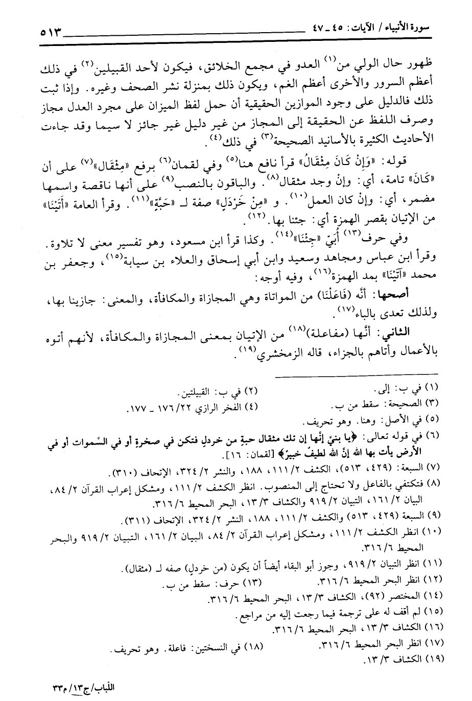 قوله: {وَإِن كَانَ مِثْقَالَ} قرأ نافع هنا وفي لقمان برفع «مِثْقَال» على أن «كَانَ» تامة، أي: وإنْ وجد مثقال. والباقون بالنصب على أنها ناقصة واسمها مضمر، أي: وإنْ كان العمل. و «مِنْ خَرْدَلٍ» صفة ل «حَبَّةٍ» . وقرأ العامة «أَتَيْنَا» من الإتيان بقصر الهمزة، وفيه أوجه: