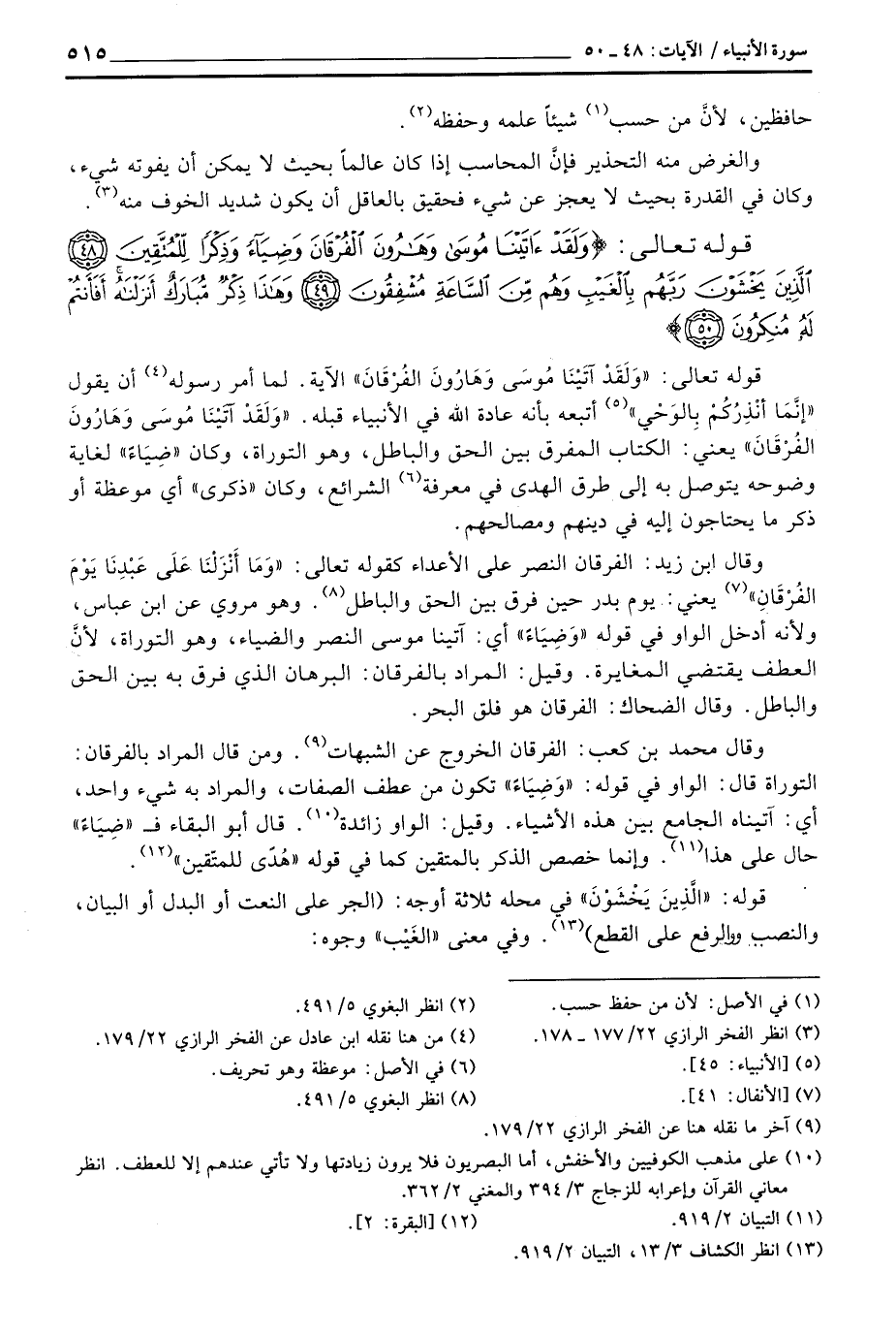 قوله تعالى: {وَلَقَدْ آتَيْنَا موسى وَهَارُونَ الفرقان} الآية. لما أمر رسوله أن يقول {إِنَّمَآ أُنذِرُكُم بالوحي} [الأنبياء: 45] أتبعه بأنه عادة الله في الأنبياء قبله. {وَلَقَدْ آتَيْنَا موسى وَهَارُونَ الفرقان} يعني: الكتاب المفرق بين الحق والباطل، وهو التوراة، وكان «ضِيَاءٌ» لغاية وضوحه يتوصل به إلى طرق الهدى في معرفة الشرائع، وكان «ذكرى» أي موعظة أو ذكر ما يحتاجون إليه في دينهم ومصالحهم.