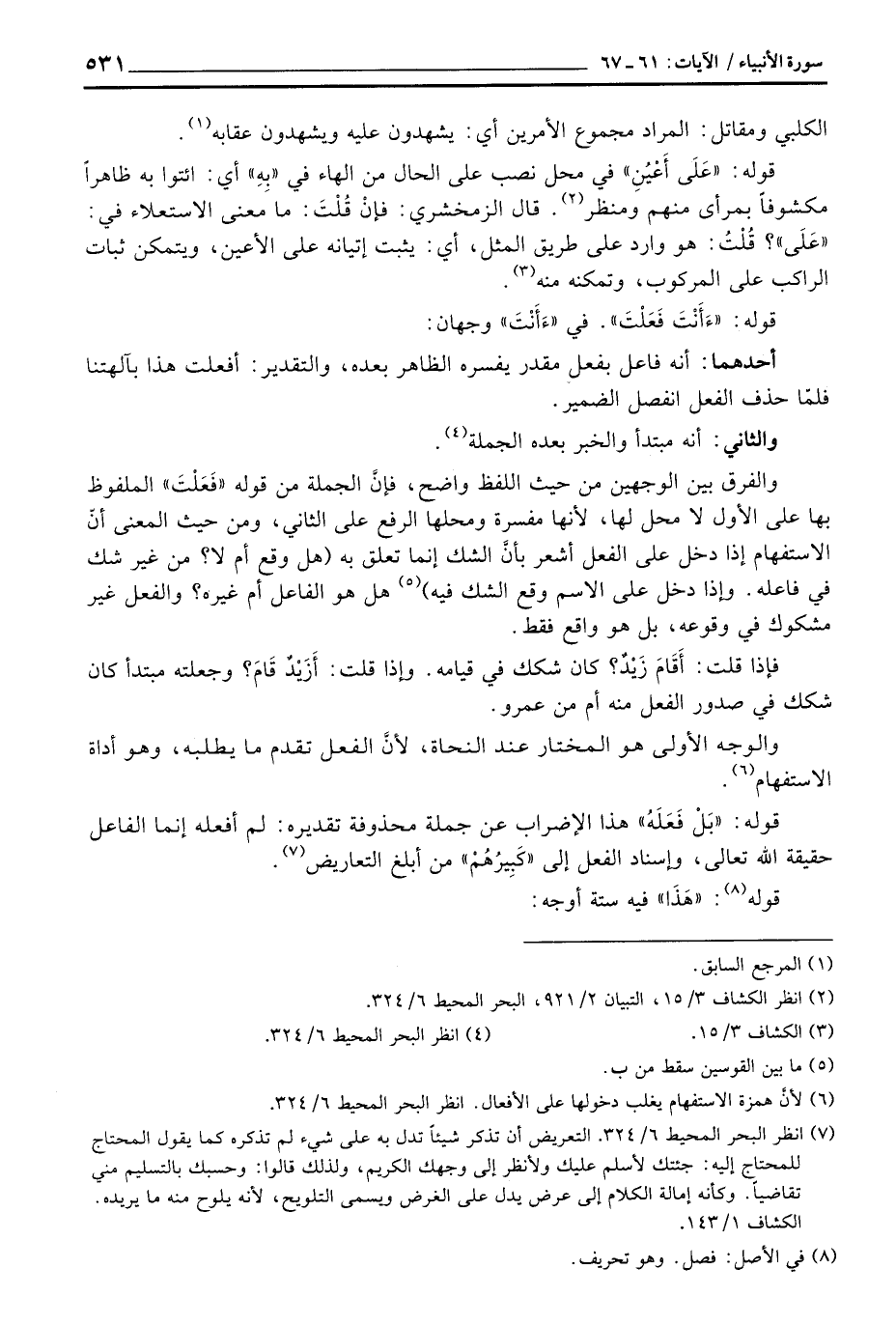 قوله: {بَلْ فَعَلَهُ} هذا الإضراب عن جملة محذوفة تقديره: لم أفعله إنما الفاعل حقيقة الله تعالى، وإسناد الفعل إلى» كَبِيرُهُمْ «من أبلغ التعاريض.
