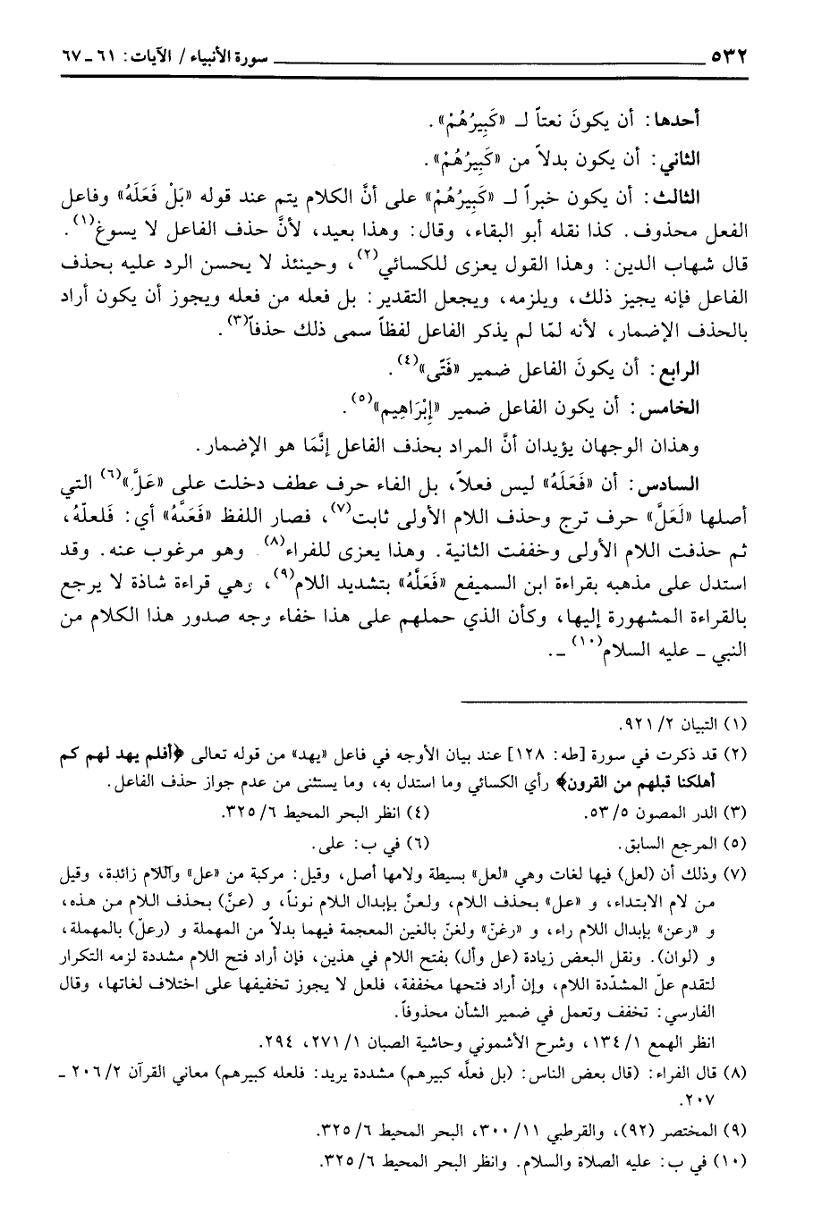 الثالث: أن يكون خبراً ل» كَبِيرُهُمْ «على أنَّ الكلام يتم عند قوله» بَلْ فَعَلَهُ «وفاعل الفعل محذوف. كذا نقله أبو البقاء، وقال: وهذا بعيد، لأنَّ حذف الفاعل لا يسوغ. قال شهاب الدين: وهذا القول يعزى للكسائي، وحينئذ لا يحسن الرد عيله بحذف الفاعل فإنه يجيز ذلك، ويلزمه، ويجعل التقدير: بل فعله من فعله ويجوز أن يكون أراد بالحذف الإضمار، لأنه لمّا لم يذكر الفاعل لفظاً سمى ذلك حذفاً.