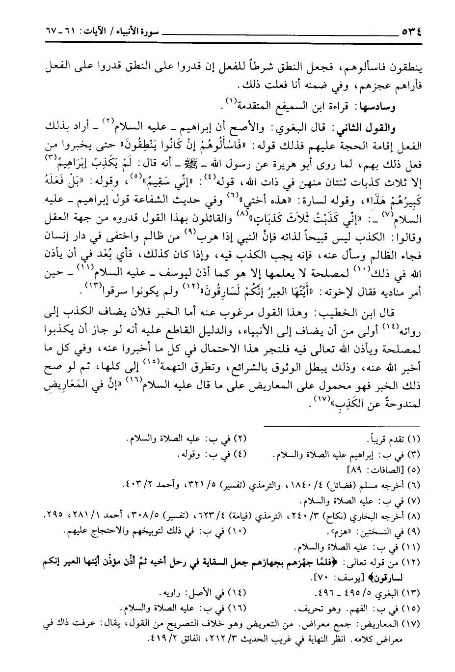 والقول الثاني: قال البغوي: والأصح أن إبراهيم - عليه السلام - أراد بذلك الفعل إقامة الحجة عليهم فذلك قوله: {هذا فَاسْأَلُوهُمْ} حتى يخبروا من فعل ذلك بهم، لما «روي أبو هريرة عن رسول الله - صَلَّى اللَّهُ عَلَيْهِ وَسَلَّم َ - أنه قال: لَمْ يَكْذِبْ إبْرَاهِيمُ إلا ثلاث كذبات ثنتان منهن في ذات الله، قوله:» إنِّي سَقِيمٌ «، وقوله:» بَلْ فَعَلَهُ كَبِيرُهُمْ هَذَا «، وقوله لسارة:» هذه أختي «وفي حديث الشفاعة قول إبراهيم - عليه السلام -» إنِّي كَذَبْتُ ثَلاَثَ كَذِبَاتٍ «والقائلون بهذا القول قدروه من جهة العقل وقالوا: الكذب ليس قبيحاً لذاته فإنَّ النبي إذا هرب من ظالم واختفى في دار إنسان فجاء الظالم وسأل عنه، فإنه يجب الكذب فيه، وإذا كان كذلك، فأي بُعْد في ان يأذن الله في ذلك لمصلحة لا يعلمها إلا هو كما أذن ليوسف - عليه السلام - حين أمر مناديه لإخوته: {أَيَّتُهَا العير إِنَّكُمْ لَسَارِقُونَ} [يوسف: 70] ولم يكونوا سرقوا.