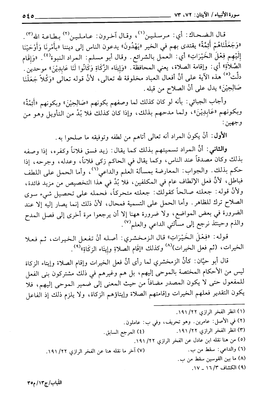 قال الضحاك: أي: مرسلين، وقال آخرون: عاملين بطاعة الله. «وَجَعَلْنَاهُمْ أَئِمَّةً» يقتدى بهم في الخبر «يَهْدُونَ» يدعون الناس إلى ديننا {بِأَمْرِنَا وَأَوْحَيْنَآ إِلَيْهِمْ فِعْلَ الخيرات} أي: العمل بالشرائع. وقال أبو مسلم: المراد النبوة. «وَإِقَام الصَّلاَةِ» أي: وإقامة الصلاة، يعني المحافظة؟ {وَإِيتَآءَ الزكاة وَكَانُواْ لَنَا عَابِدِينَ} موحدين. دلَّت هذه الآية على أنَّ أفعال العباد مخلوقة لله تعالى، لأنَّ قوله تعالى: {وَكُلاًّ جَعَلْنَا صَالِحِينَ} يدل على أنّ الصلاح من قبله.